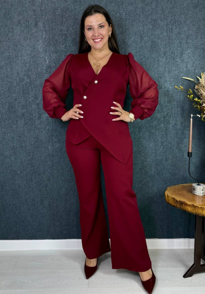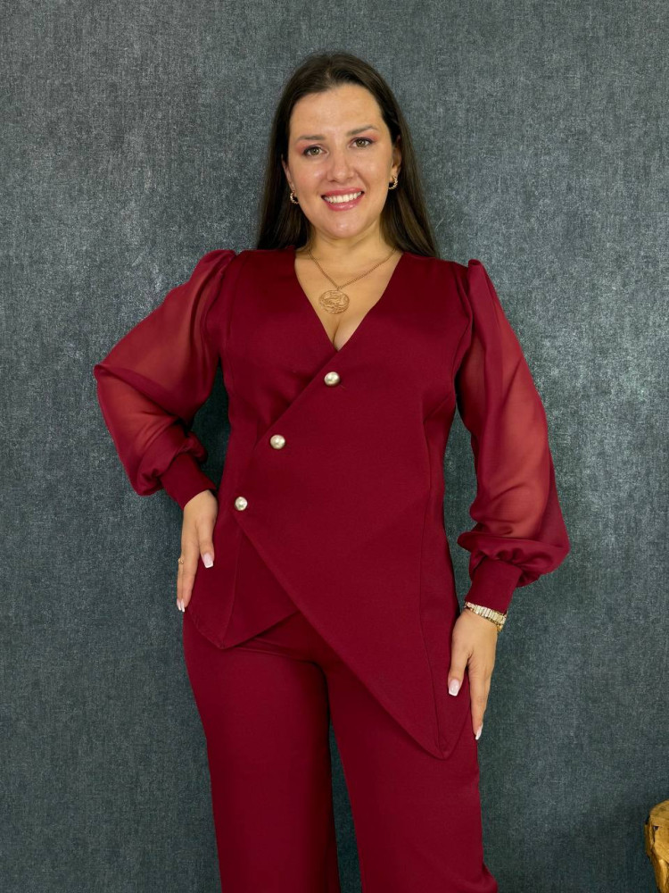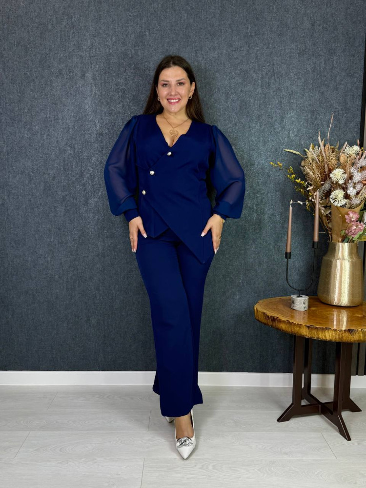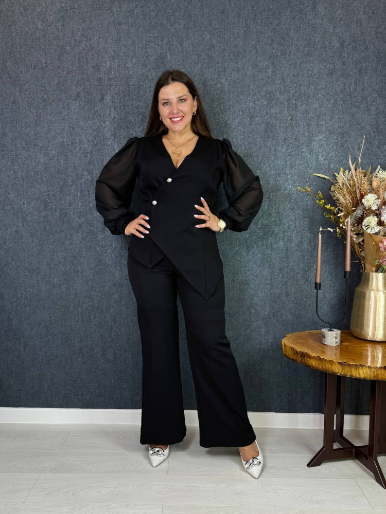 Жакет на ґудзиках, асиметрія по низу, рукава з шифону на манжетах ; штани застібаються збоку на молнію