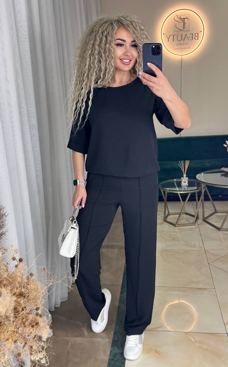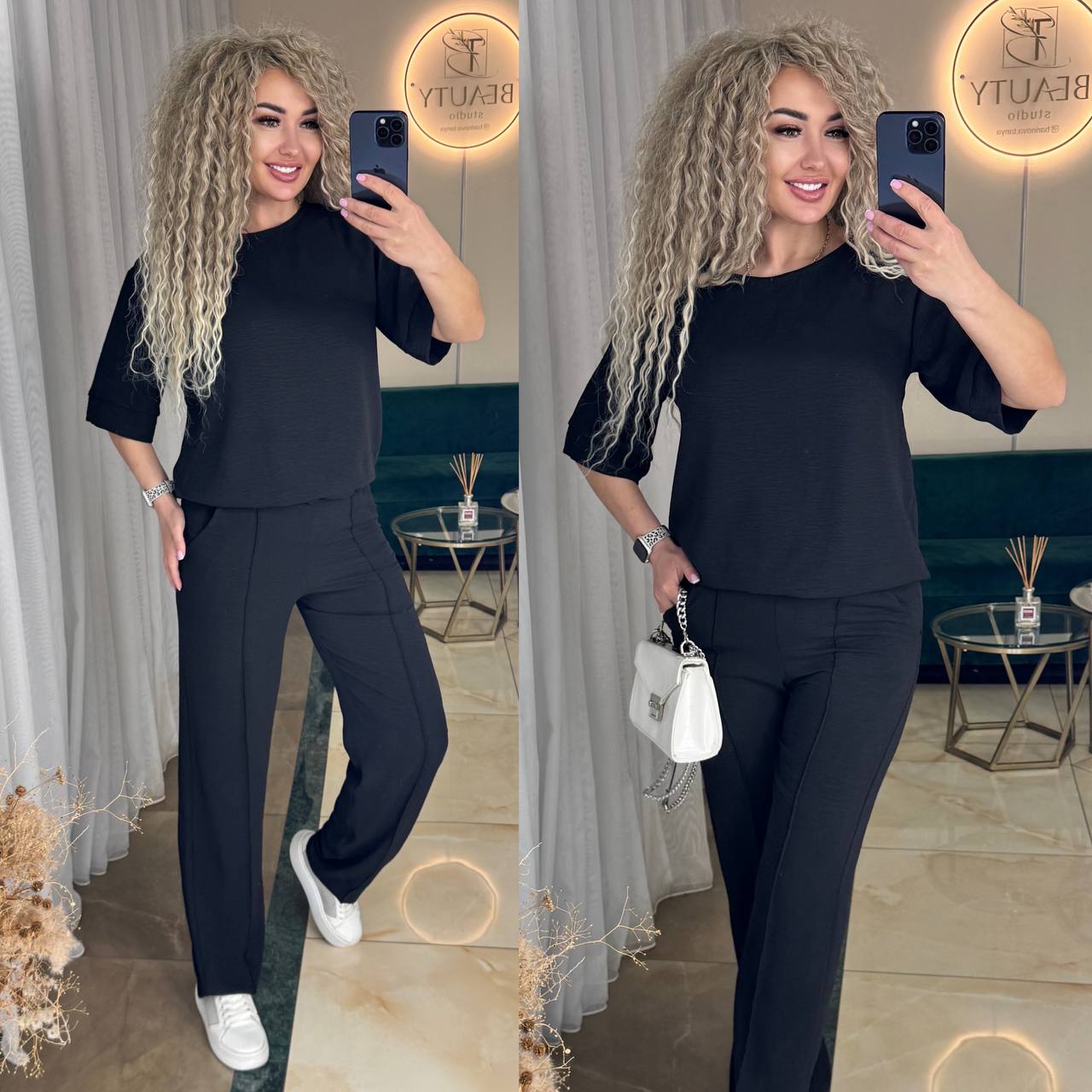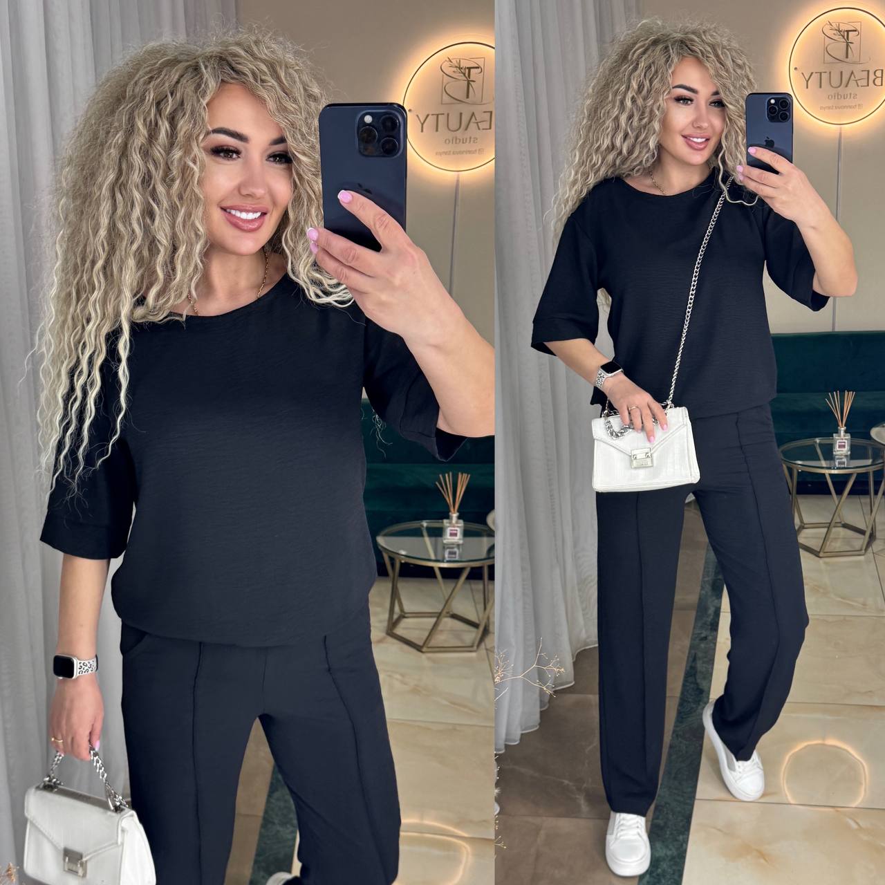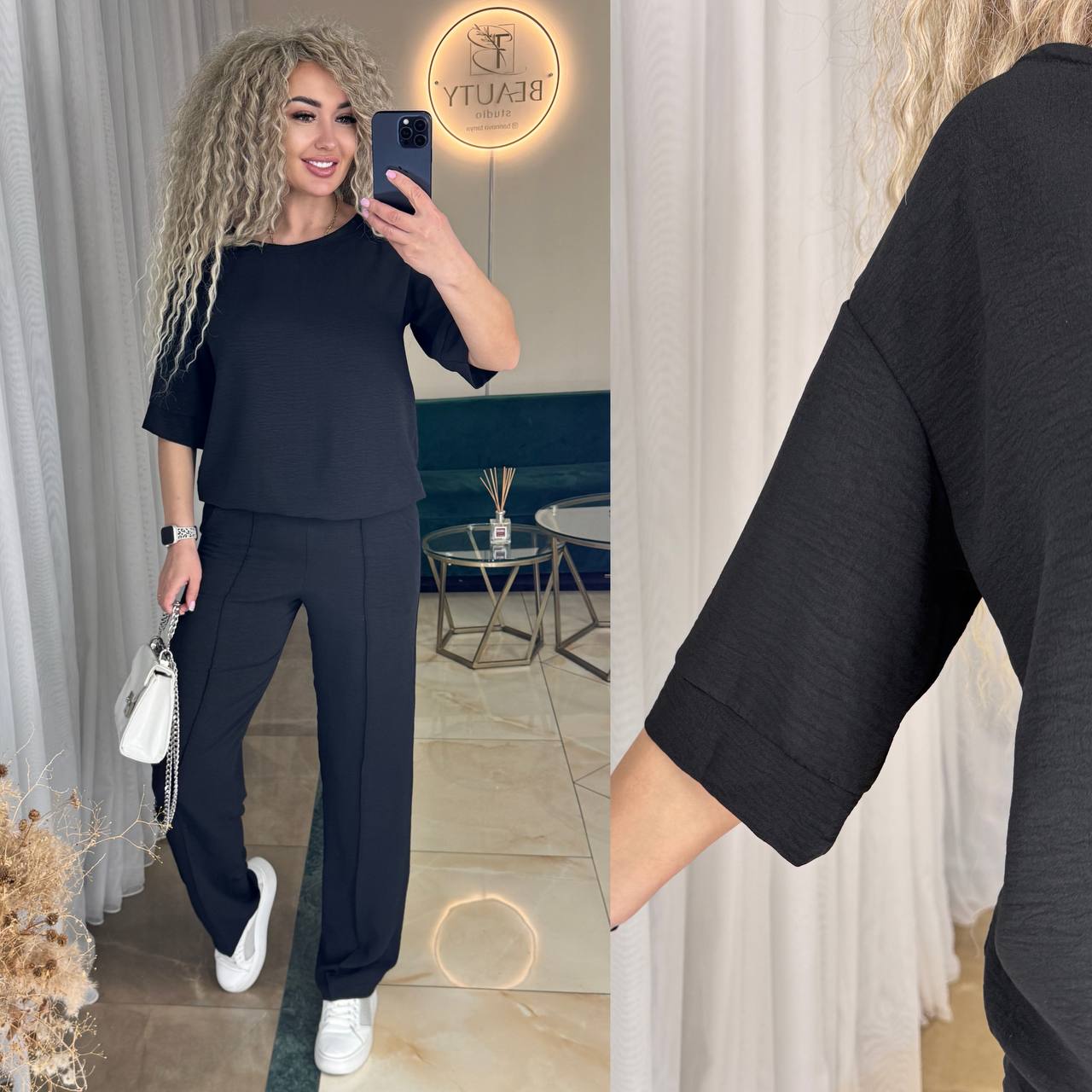 Тканина: якісний американський креп жатка, приємний до тіла та комфортний у носінні. Костюм складається з прямої кофти з куліскою по низу та штанів на резинці. Модель представлена у базових кольорах, ідеально підходить для літніх образів. Гарно комбінується з кедами чи сандалями.