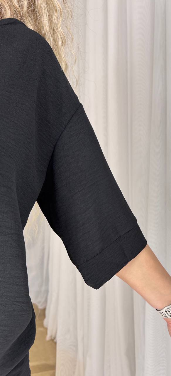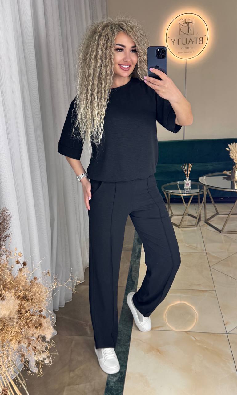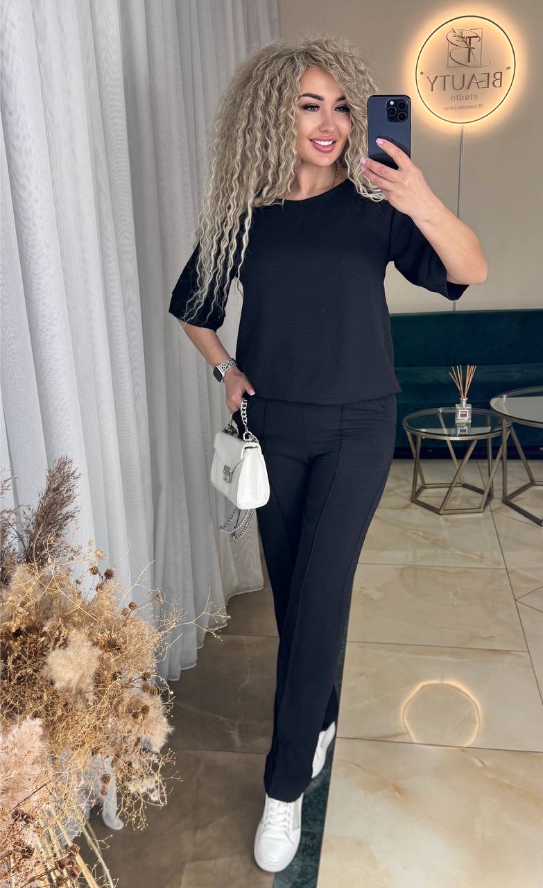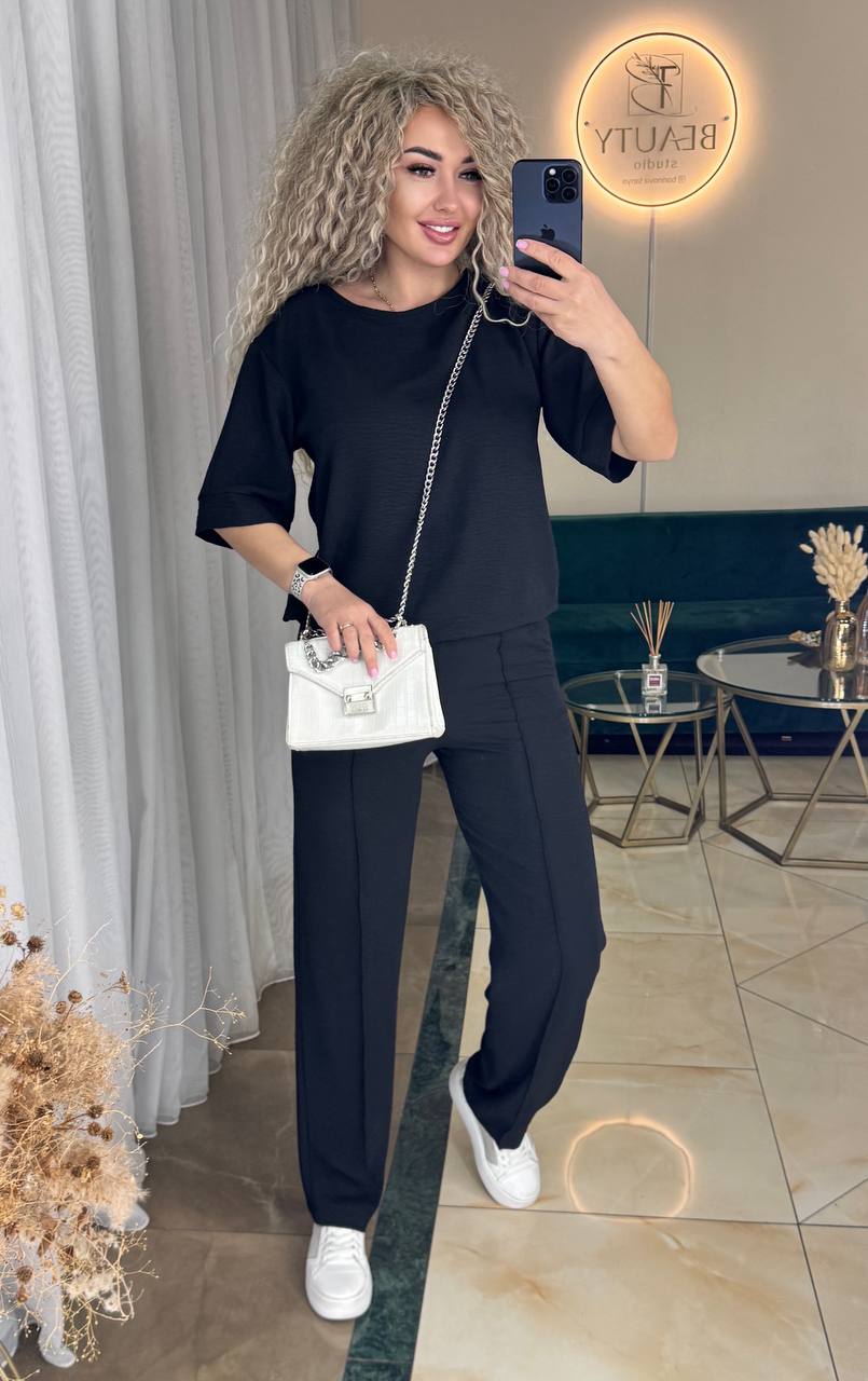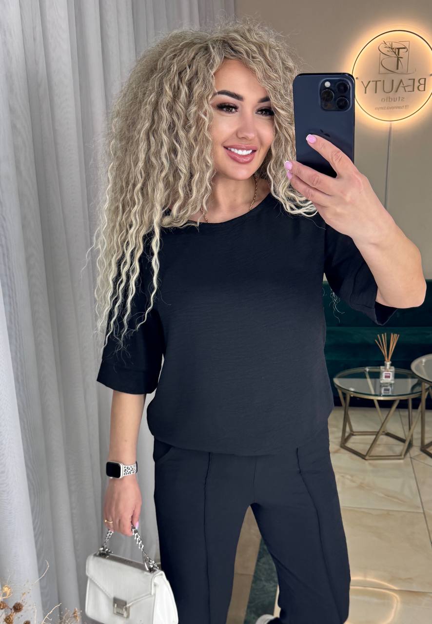 Тканина: якісний американський креп жатка, приємний до тіла та комфортний у носінні. Костюм складається з прямої кофти з куліскою по низу та штанів на резинці. Модель представлена у базових кольорах, ідеально підходить для літніх образів. Гарно комбінується з кедами чи сандалями.