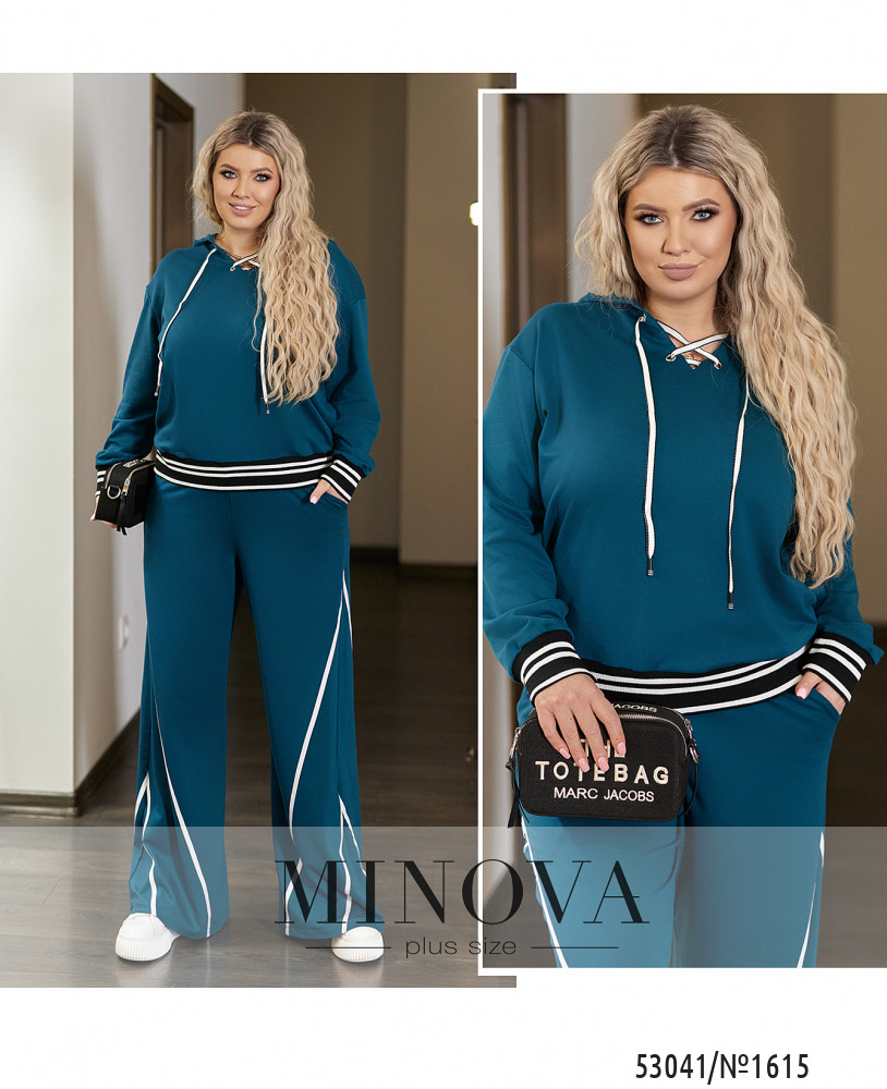 Костюм, який закохує в себе з першого погляду! Універсальний і мега комфортний. Худі вільного крою з капюшоном, на грудях має шнурівку , низ худі і манжети прикрашені рибаною, штани високої посадки з бічними кишенями, вільного крою.
