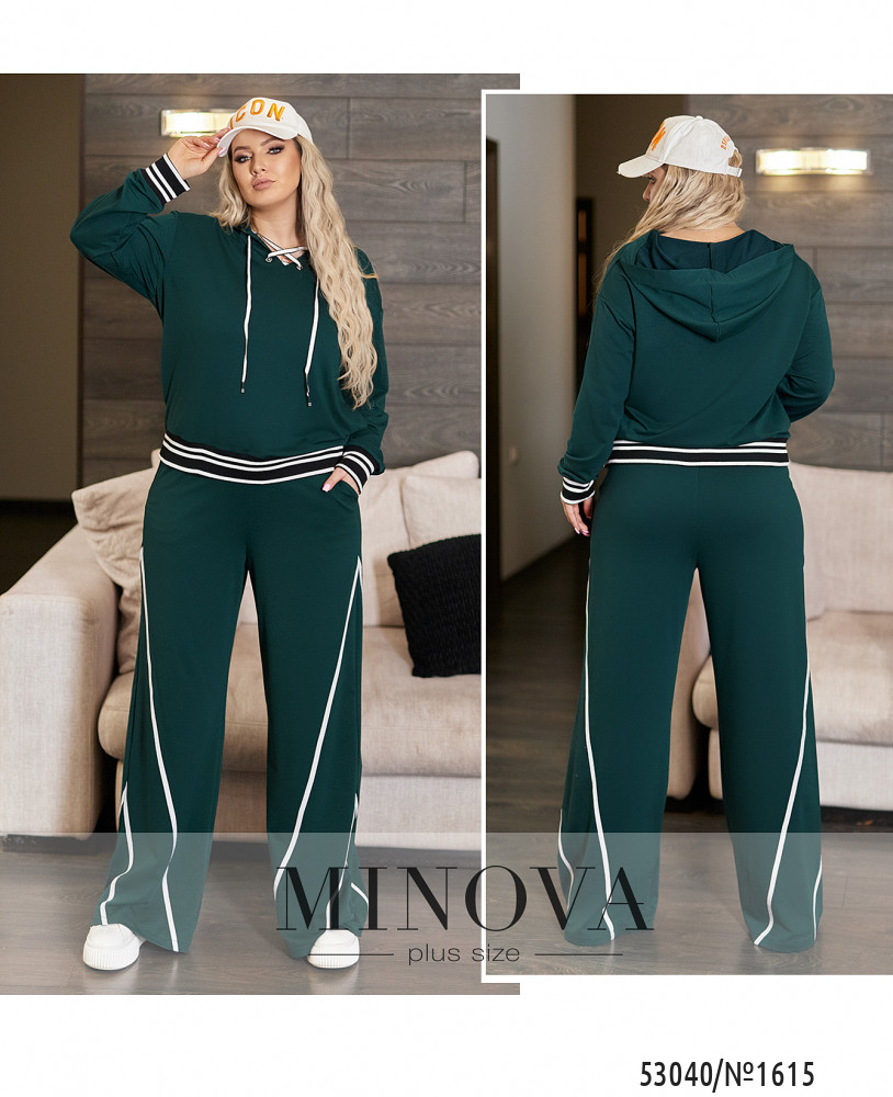 Костюм, який закохує в себе з першого погляду! Універсальний і мега комфортний. Худі вільного крою з капюшоном, на грудях має шнурівку , низ худі і манжети прикрашені рибаною, штани високої посадки з бічними кишенями, вільного крою.