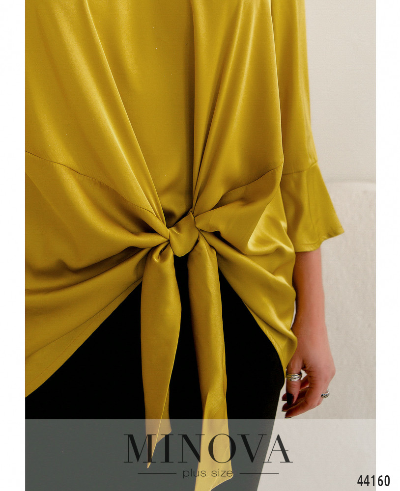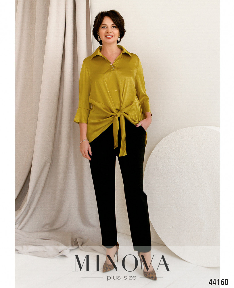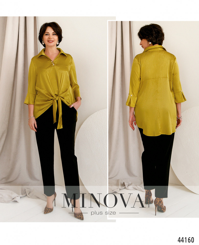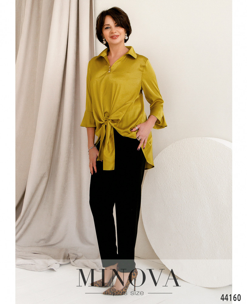 Елегантний та оригінальний костюм великого розміру. Блуза з декоративними гудзиками від відкладного комірця, на талії зав'язується на вузол. Рукава з розкльошеними манжетами та декоративними гудзиками. Без застібок і кишень. Поділ по спинці довше, відрізний, спадає м'якими оборками. Брюки з високою талією, до поясу вшито резинку, з боків - кишені в шві.