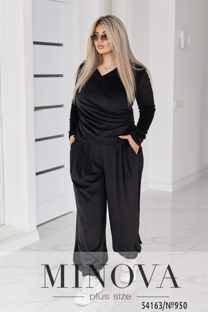 Стильний жіночий костюм у трендових відтінках, що поєднує комфорт і витончену жіночність. Виконаний з м’якого, приємного до тіла велюру з легким благородним блиском, який красиво переливається при русі.Кофта приталенного силуету, з драпіровкою по переду, яка коригує фігуру, запах з V-подібним вирізом, що візуально підкреслює лінію декольте.Штани Аладіни - вільний крій , висока посадка з комфортним поясом, ззаду на талії на резинці. М’які складки спереду, низ штанин зібраний на резинку