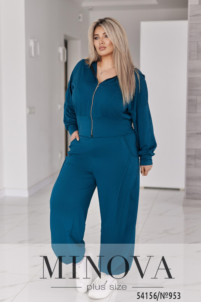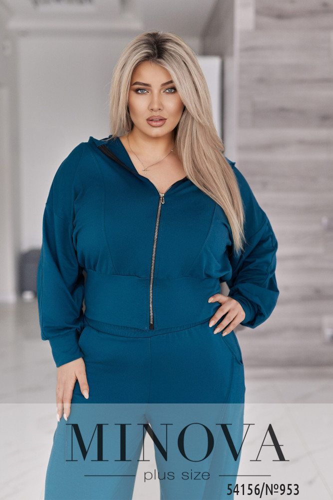 Жіночий костюм у сучасному міському стилі, що поєднує комфорт і виразний силует. Комплект складається з кофти та штанів.Кофта укороченого крою з капюшоном виконана з рельєфними швами спереду, які красиво формують фігуру. Застібається на блискавку. Рукави об’ємні, зі спущеною лінією плеча та м’якою призбіркою, манжети — з основної тканини. По низу — широкий притачний пояс, який підкреслює талію та створює акуратну посадку.Штани вільного крою з об’ємом у зоні стегон і штанин. Висока посадка та еластичний пояс на гумці забезпечують комфорт протягом усього дня. Є бічні кишені з рельєфними швами. Низ штанин доповнений резинкою та регулятором-стопером, що дозволяє змінювати форму та фіксувати бажаний об’єм.Це костюм, у якому зручно рухатися, жити та виглядати стильно. Насичені трендові кольори додають образу глибини й роблять його виразним та дорогим на вигляд.