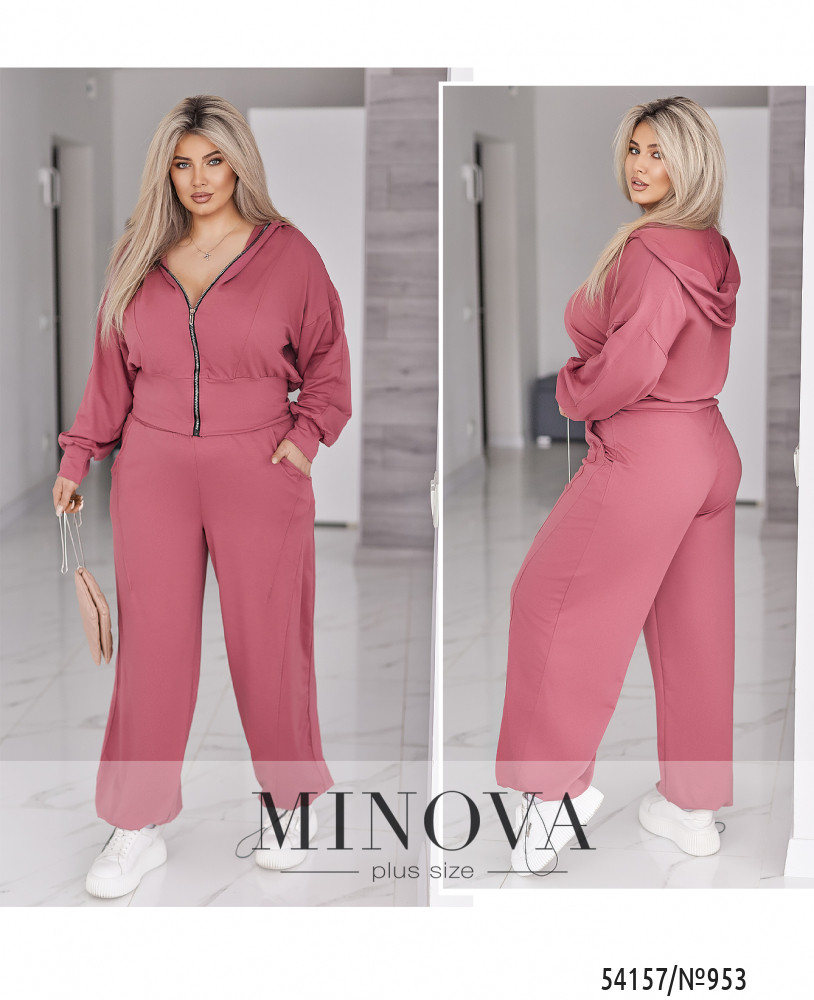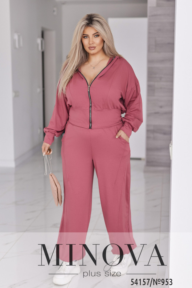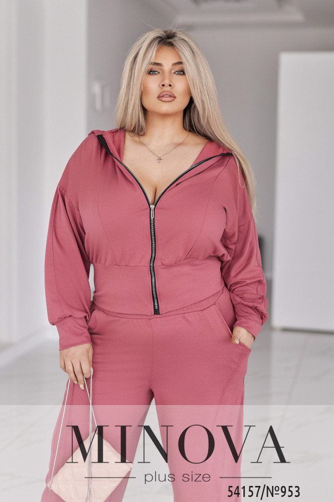 Жіночий костюм у сучасному міському стилі, що поєднує комфорт і виразний силует. Комплект складається з кофти та штанів.Кофта укороченого крою з капюшоном виконана з рельєфними швами спереду, які красиво формують фігуру. Застібається на блискавку. Рукави об’ємні, зі спущеною лінією плеча та м’якою призбіркою, манжети — з основної тканини. По низу — широкий притачний пояс, який підкреслює талію та створює акуратну посадку.Штани вільного крою з об’ємом у зоні стегон і штанин. Висока посадка та еластичний пояс на гумці забезпечують комфорт протягом усього дня. Є бічні кишені з рельєфними швами. Низ штанин доповнений резинкою та регулятором-стопером, що дозволяє змінювати форму та фіксувати бажаний об’єм.Це костюм, у якому зручно рухатися, жити та виглядати стильно. Насичені трендові кольори додають образу глибини й роблять його виразним та дорогим на вигляд.