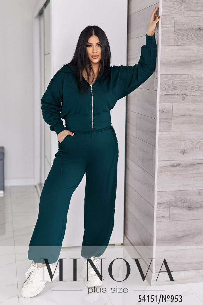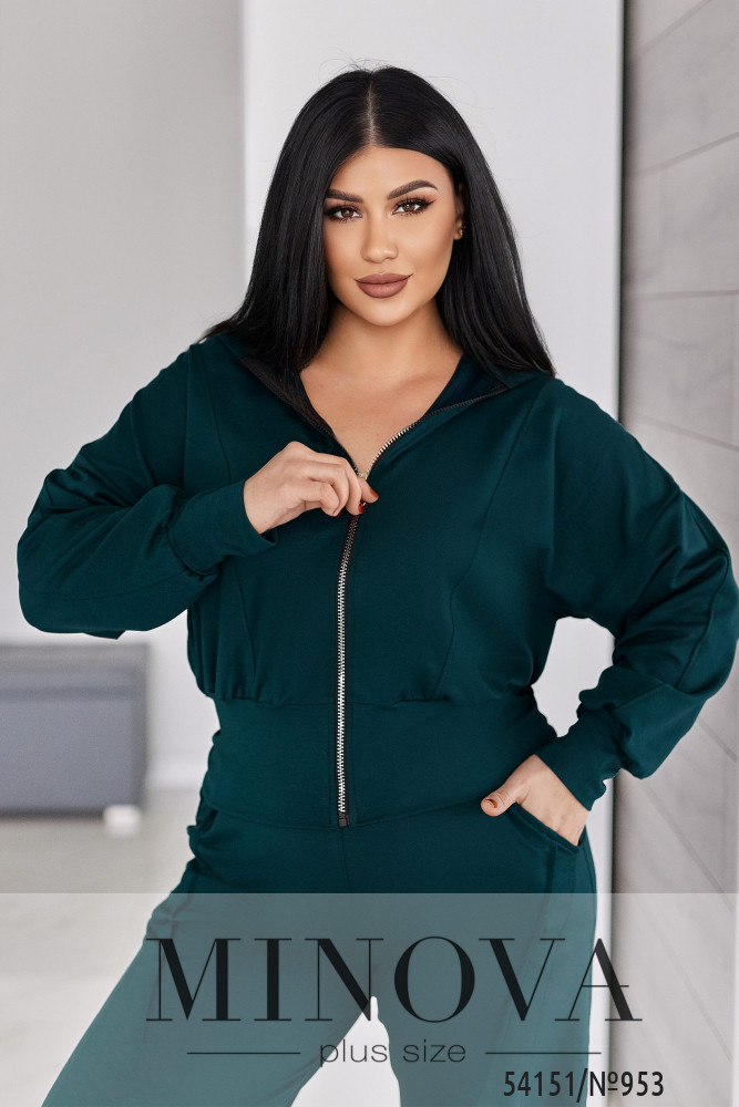 Жіночий костюм у сучасному міському стилі, що поєднує комфорт і виразний силует. Комплект складається з кофти та штанів.Кофта укороченого крою з капюшоном виконана з рельєфними швами спереду, які красиво формують фігуру. Застібається на блискавку. Рукави об’ємні, зі спущеною лінією плеча та м’якою призбіркою, манжети — з основної тканини. По низу — широкий притачний пояс, який підкреслює талію та створює акуратну посадку.Штани вільного крою з об’ємом у зоні стегон і штанин. Висока посадка та еластичний пояс на гумці забезпечують комфорт протягом усього дня. Є бічні кишені з рельєфними швами. Низ штанин доповнений резинкою та регулятором-стопером, що дозволяє змінювати форму та фіксувати бажаний об’єм.Це костюм, у якому зручно рухатися, жити та виглядати стильно. Насичені трендові кольори додають образу глибини й роблять його виразним та дорогим на вигляд.