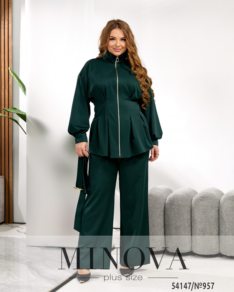 Жіночий костюм, що складається з блузи на блискавці та широких штанів.Блуза напівприталеного силуету,спереду і по спинці на талії з мʼякими складками , що формують ефектну баску. Спереду- золотиста застібка блискавка. Рукав: довгий, об’ємний , низ рукава зібраний на манжету.Комір: стійка (можливість носіння у відкритому та закритому вигляді).Пояс: знімний, із декоративною золотистою пряжкою, регулює посадку по талії і змінює настрій образу.Штани вільного крою прямі, посадка висока, в поясі на гумці, з кишенями.