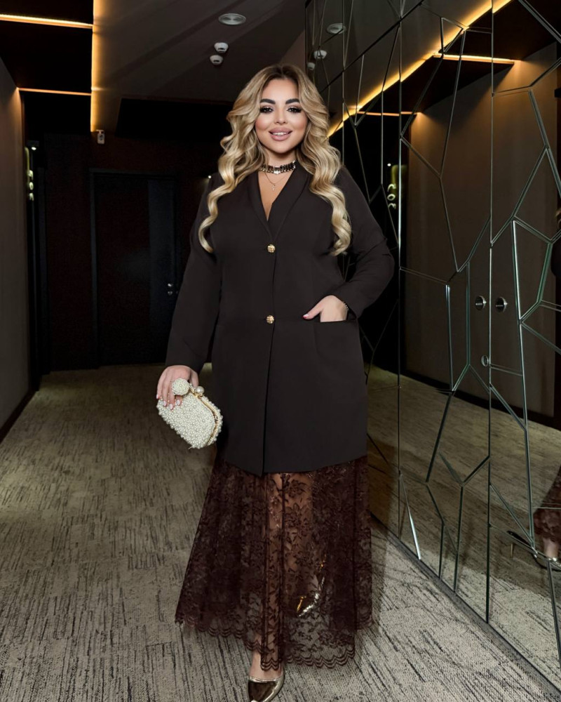 Жакет застібається на золоті ґудзики, комір-стійка, з боків великі кишені, довгий рукав; спідниця на резинці на трикотажній підкладці