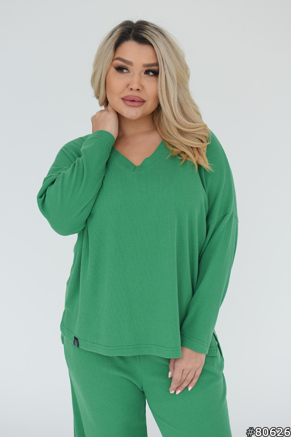 Костюм щільний Рубчик колір: Зелений Штани на резинці,з кишенями у бокових швах,кофта з V образним вирізом,спущеним плечем,подовженою спинкою і розрізами по боках