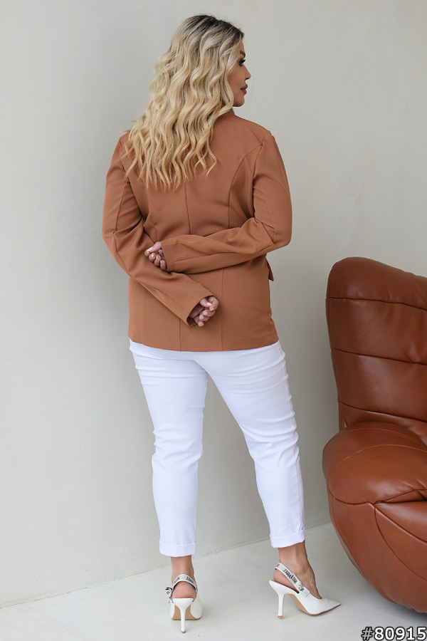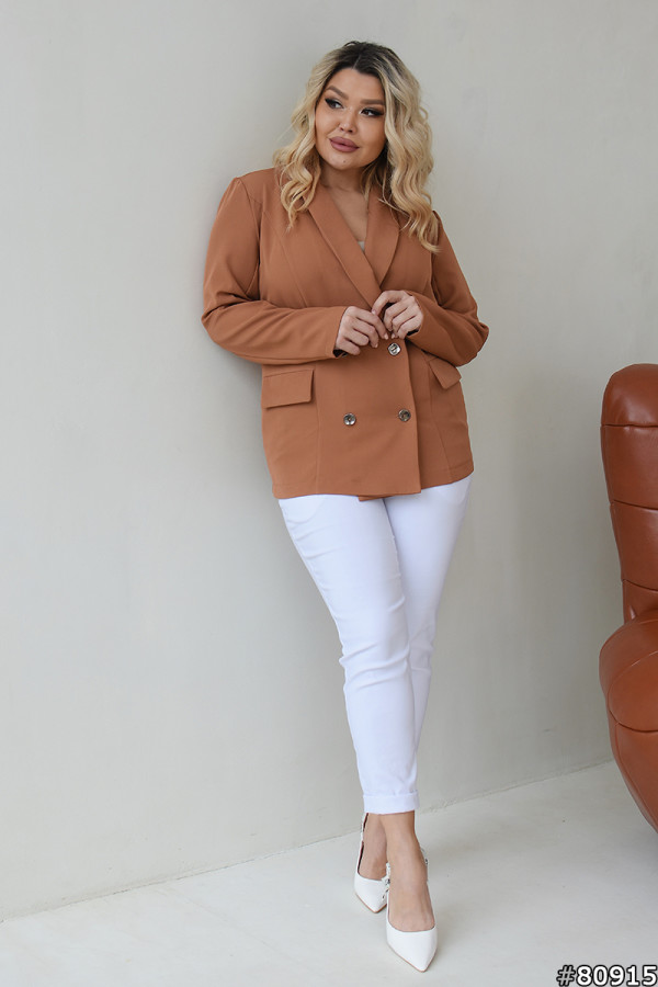 Костюм Костюмна тканина+джинс бенгалін колір: Світло коричневий Піджак-костюмка,штани-джинс бенгалін(гарно тягнеться).Піджак без підкладки,штани на резинці з кишенямиЗаміри готового виробу розмір 48-50: