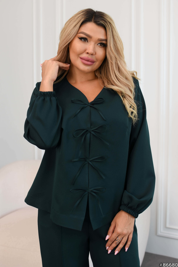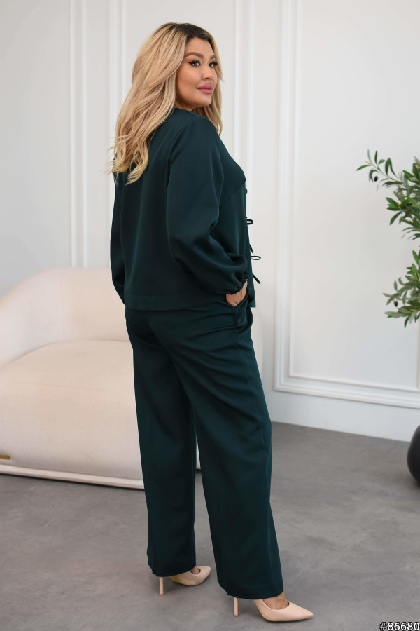 Костюм Костюмна тканина колір: Смарагд Жакет вільного крою з декоративними застібками-бантиками додає образу елегантності, під верхнім бантом — робочий гудзик.