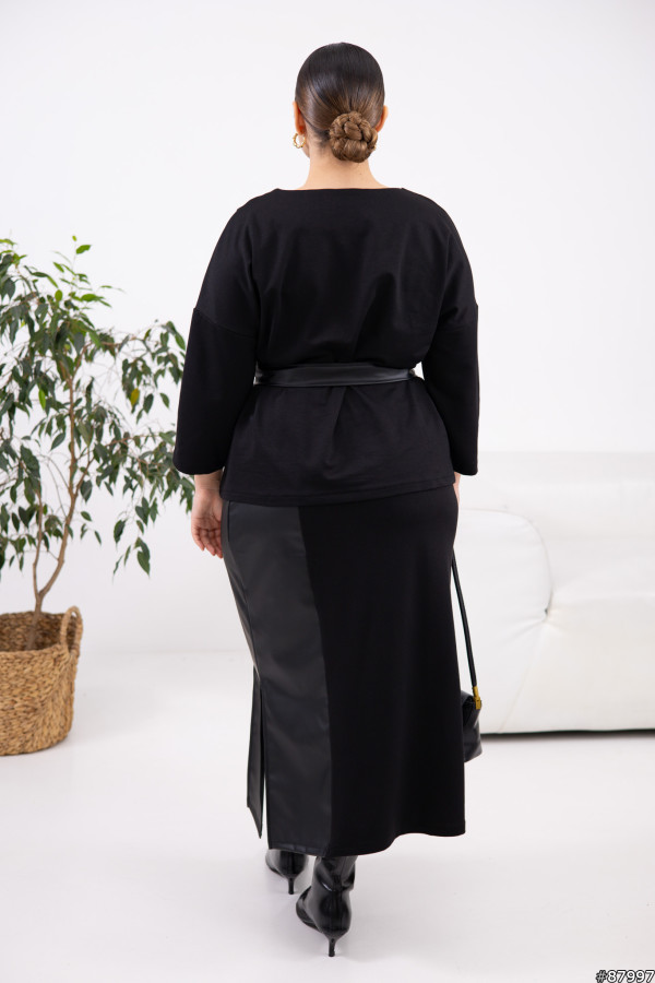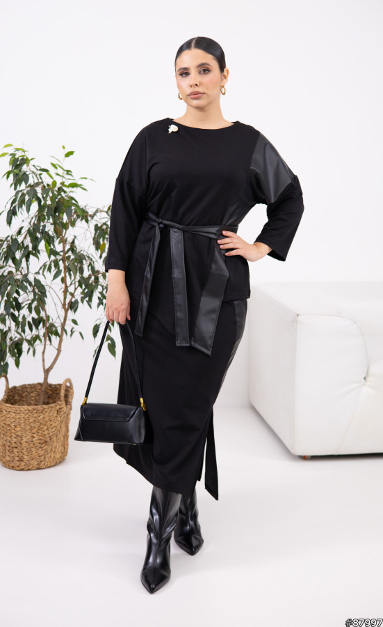 Костюм Двонитка+екошкіра колір: Чорний Спідниця має пояс на резинці.Брошка в комплекті.Тканина має гарну розтяжність, приблизно +6 см до вимірів.