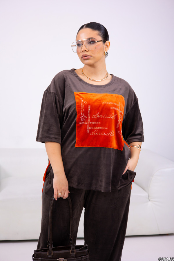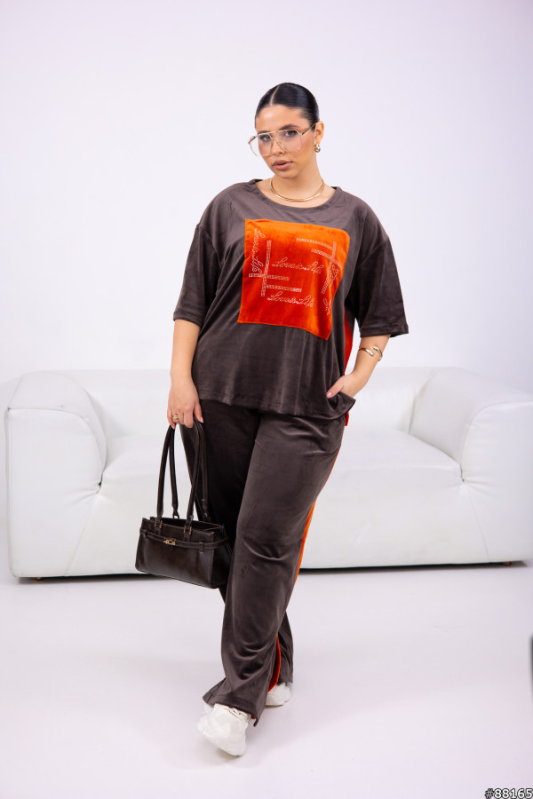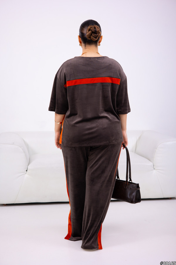 Костюм Велюр колір: Шоколад Тягнеться +5-8 см.Футболка вільного крою з боків-лампаси, а також по спинці упоперек- смужка , на грудях -принт зі страз