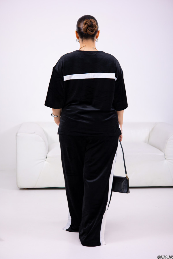 Костюм Велюр колір: Чорний Тягнеться +5-8 см.Футболка вільного крою з боків-лампаси, а також по спинці упоперек- смужка , на грудях -принт зі страз