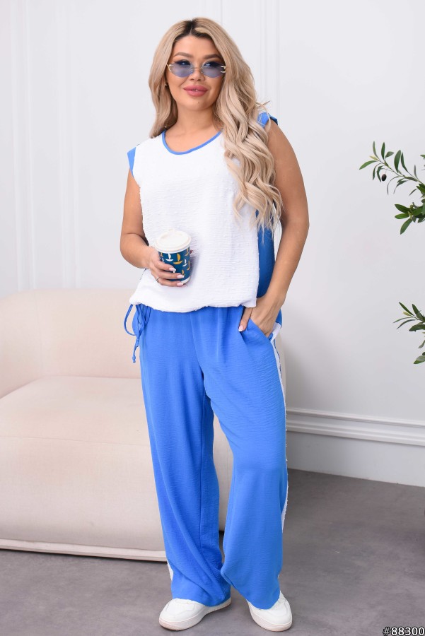 Костюм Креп+креп-жаккард колір: Блакитний Блуза вільного крою, з боків з розрізами, знизу можна затягнути куліску. Брюки вільного прямого крою з боків з кишенями, на поясі-резинці, з лампасами.Тканина- американський креп та білий креп-жаккард