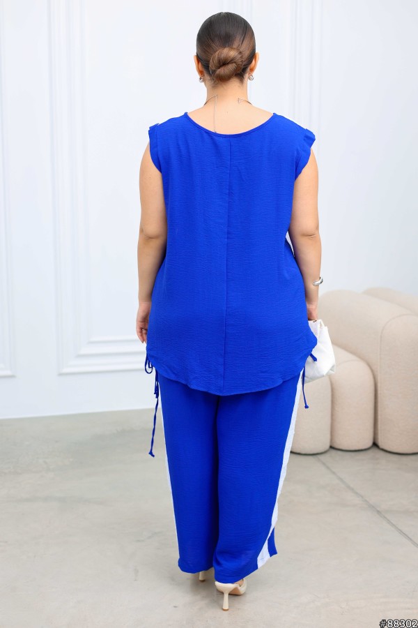 Костюм Креп+креп-жаккард колір: Синій Блуза вільного крою, з боків з розрізами, знизу можна затягнути куліску. Брюки вільного прямого крою з боків з кишенями, на поясі-резинці, з лампасами.Тканина- американський креп та білий креп-жаккард
