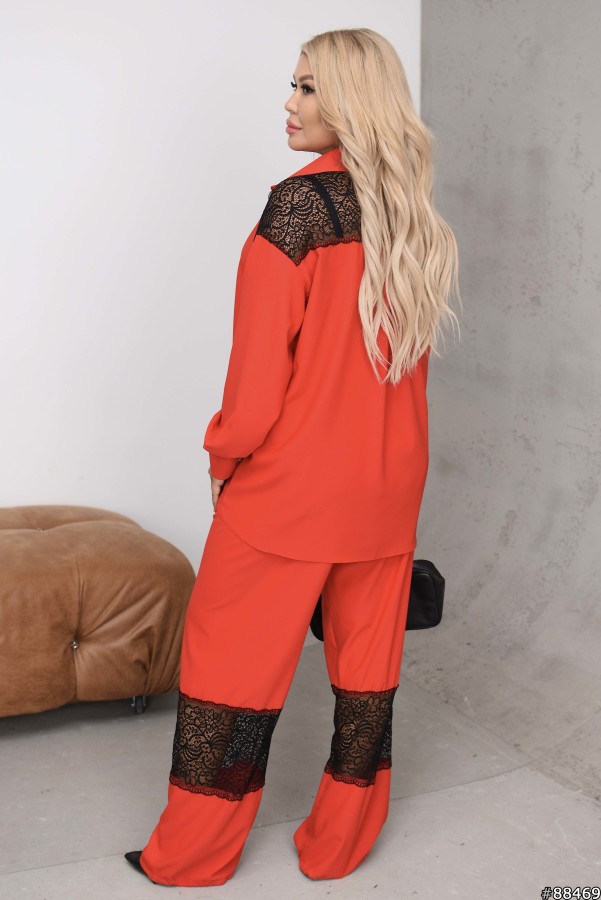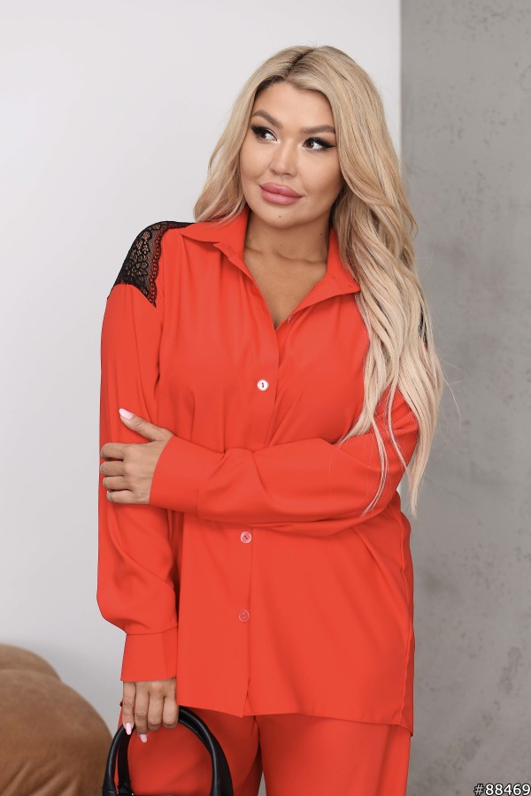 Костюм Трикотаж Кристал колір: Червоний Сорочка на ґудзиках, комір стійка, по спинці вставка кружево.Тканина: