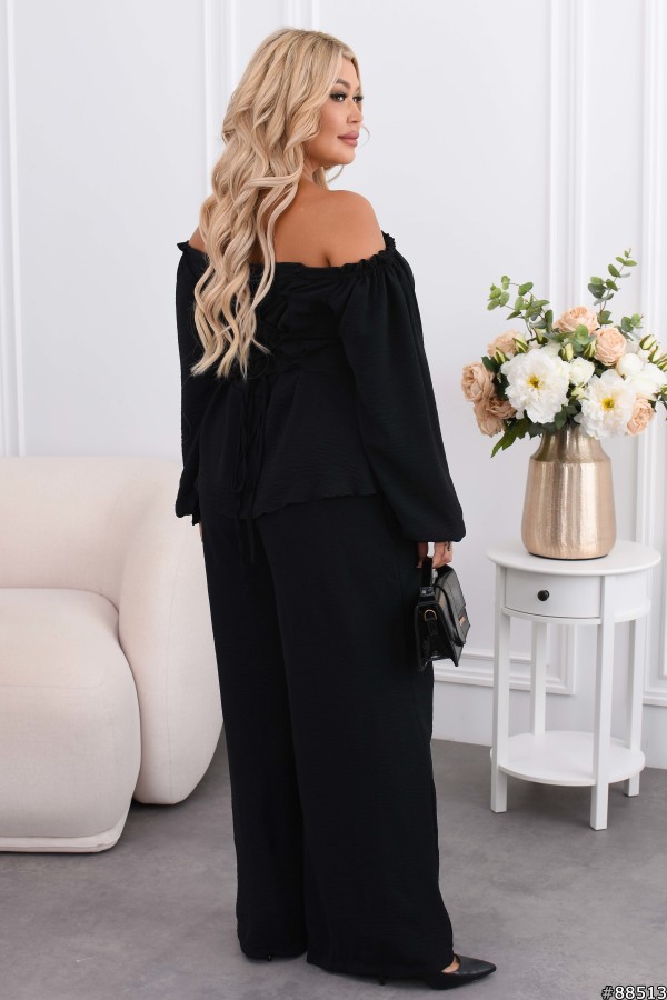 Костюм Креп жатка колір: Чорний Штани мають високу посадку .На спині шнурок , тому можна регулювати талію та об'єм грудей