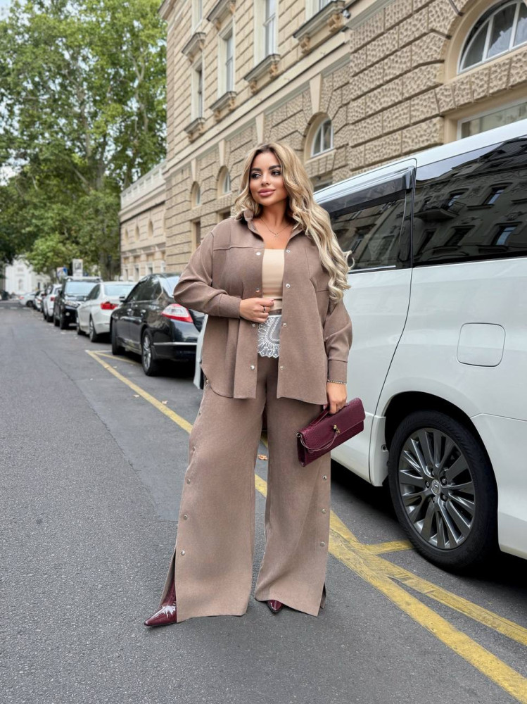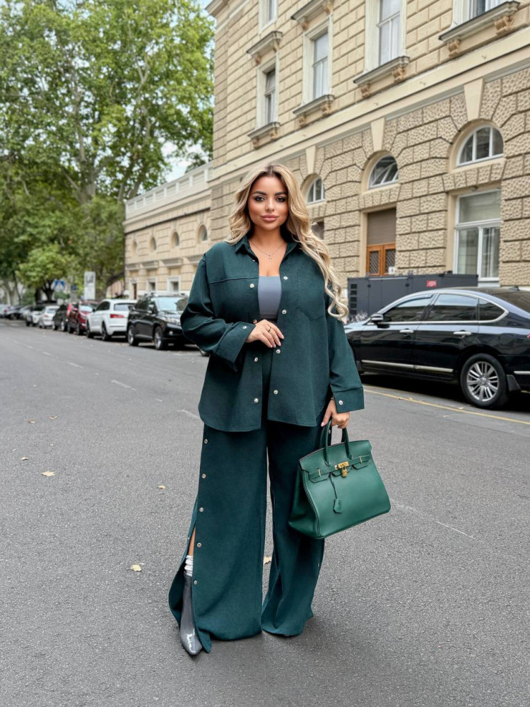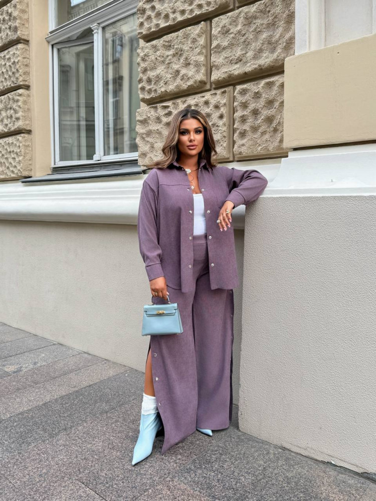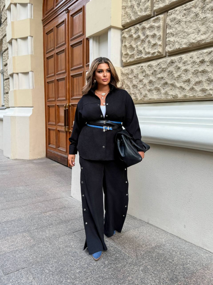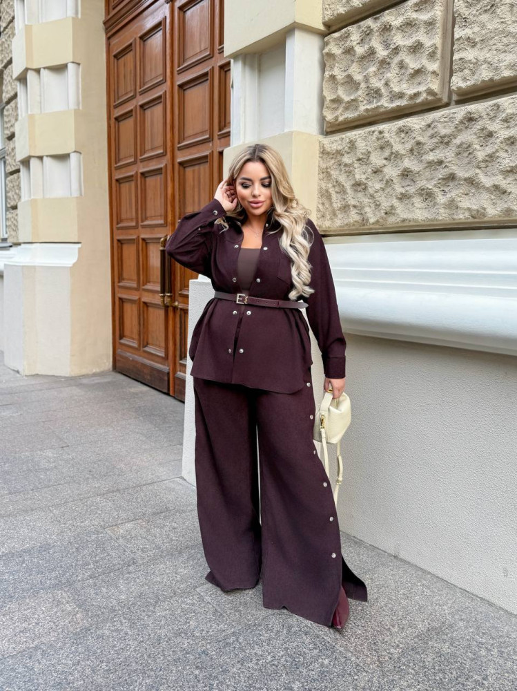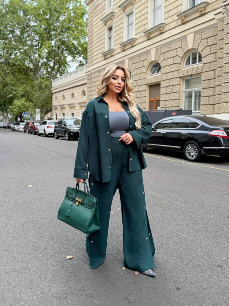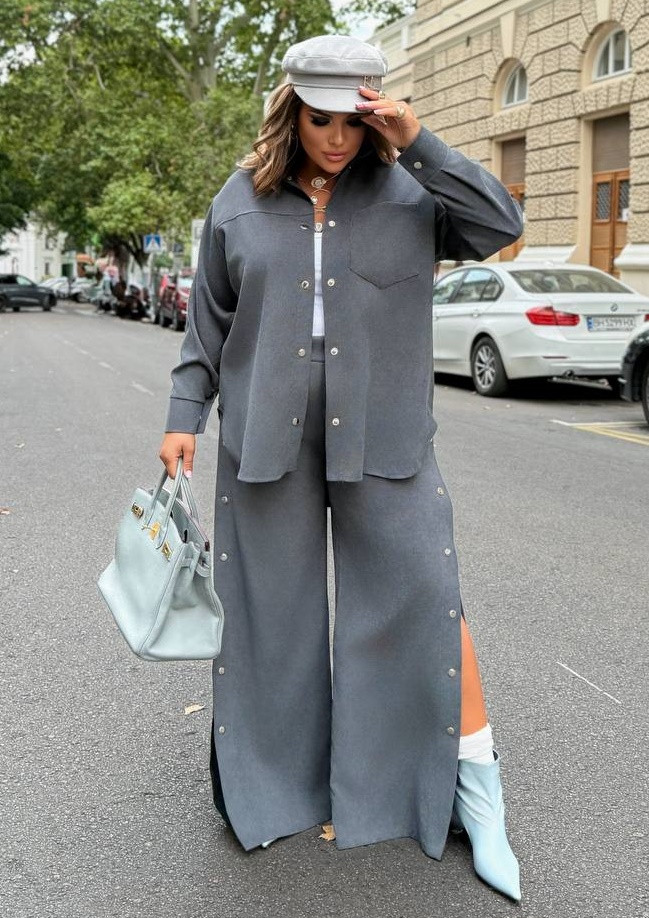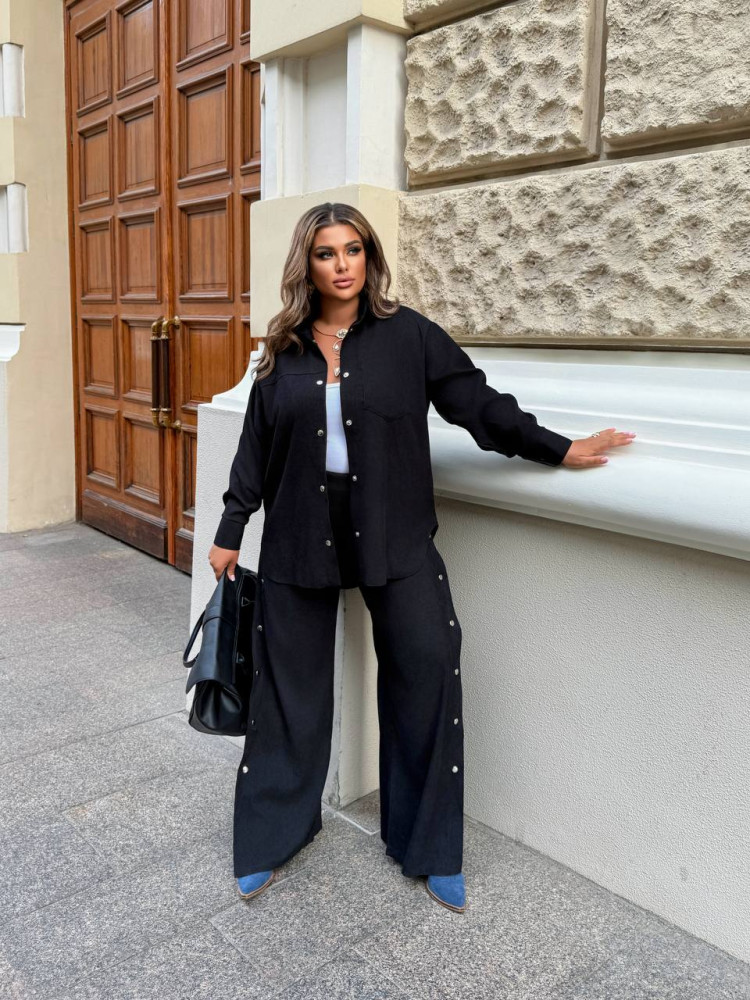 Сорочка вільного крою та брюки палацо з високою посадкою. На брюках кнопка по бокам працююча.