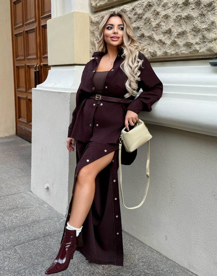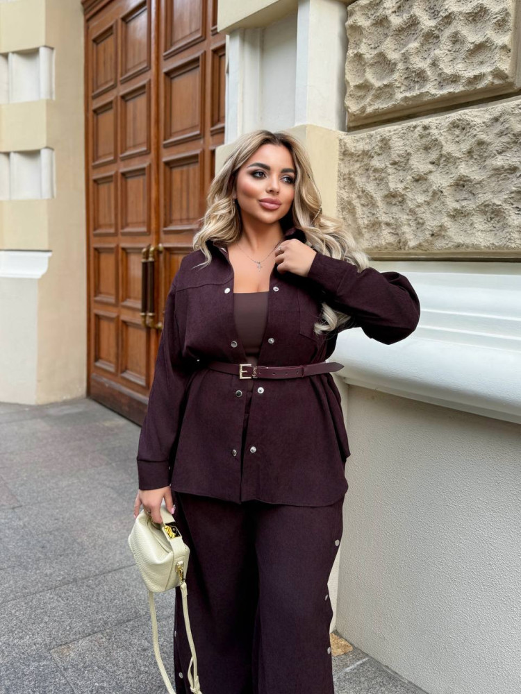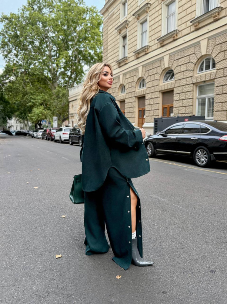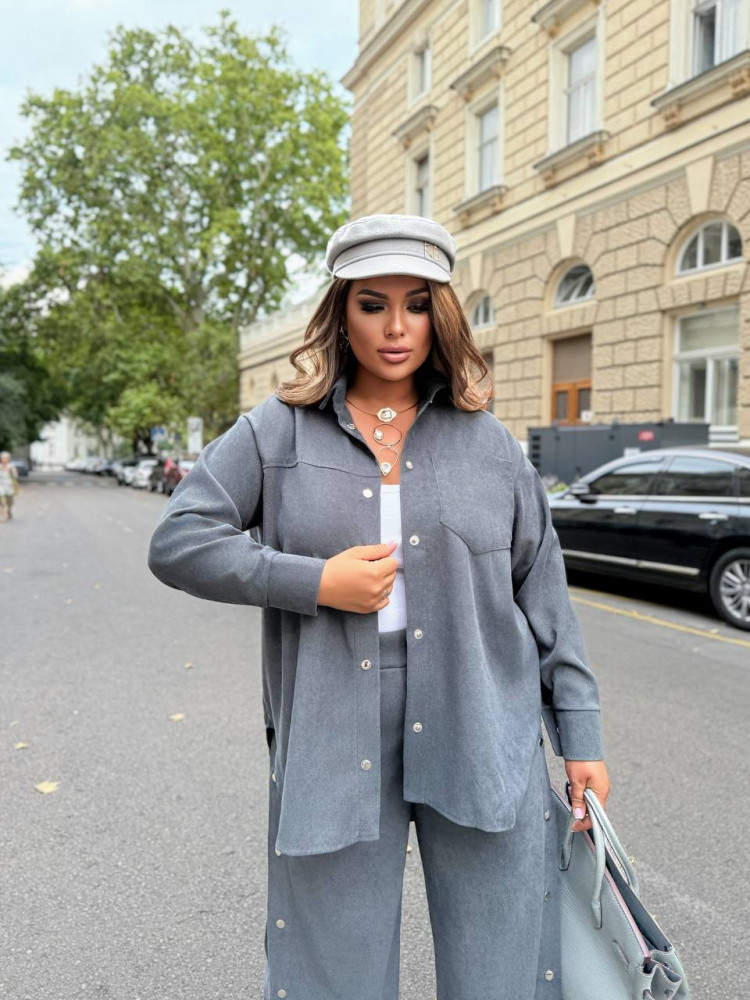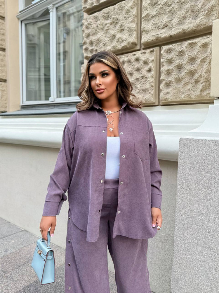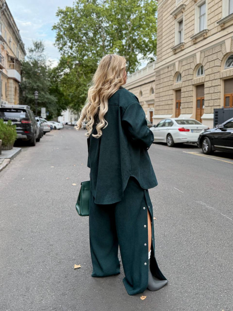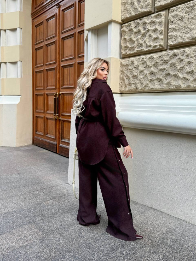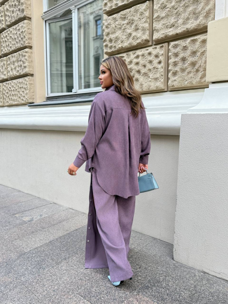 Сорочка вільного крою та брюки палацо з високою посадкою. На брюках кнопка по бокам працююча.