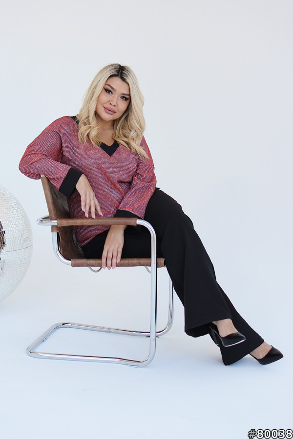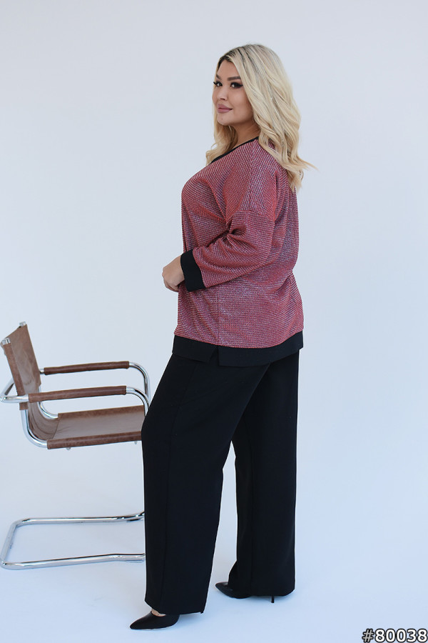 Kombinezon. Luźny sweter. Spodnie palazzo, elastyczny pas, kieszenie w szwach bocznych. Wymiary gotowego wyrobu: Wymiary gotowego wyrobu rozmiar 50-52: Kurtka: OG - 120 cm; OT-120 cm; Długość-72 cm; Długość rękawa 62 cm. od szyi; Spodnie: OT (elastyczne) - rozciągają się do 100 cm; OS- 116 cm; Długość - 106 cm; Wymiary gotowego wyrobu rozmiar 54-56: Kurtka: OG - 128 cm; OT-128 cm; Długość-73 cm; Długość rękawa 63 cm. od szyi; Spodnie: OT (elastyczne) - rozciągają się do 108 cm; OS- 124 cm; Długość - 106 cm; Wymiary gotowego wyrobu rozmiar 58-60: Kurtka: OG - 136 cm; OT - 136 cm; Długość-74 cm; Długość rękawa 64 cm. od szyi; Spodnie: OT (elastyczne) - rozciągają się do 116 cm; OS- 132 cm; Długość - 106 cm; Numer artykułu ST- 80038 Tkanina Tkanina na garnitur