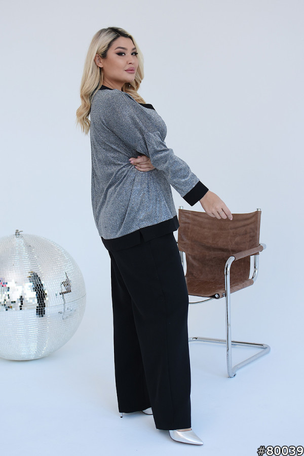 Kombinezon. Luźna kurtka. Spodnie palazzo, gumka w pasie, kieszenie w szwach bocznych. Wymiary gotowego produktu, rozmiar 50-52: Kurtka: OG - 120 cm; OT-120 cm; Długość-72 cm; Długość rękawa 62 cm. od szyi; Spodnie: OT (elastyczne) - rozciągają się do 100 cm; OS- 116 cm; Długość - 106 cm; Wymiary gotowego wyrobu rozmiar 54-56: Kurtka: OG - 128 cm; OT-128 cm; Długość-73 cm; Długość rękawa 63 cm. od szyi; Spodnie: OT (elastyczne) - rozciągają się do 108 cm; OS- 124 cm; Długość - 106 cm; Wymiary gotowego wyrobu rozmiar 58-60: Kurtka: OG - 136 cm; OT - 136 cm; Długość-74 cm; Długość rękawa 64 cm. od szyi; Spodnie: OT (elastyczne) - rozciągają się do 116 cm; OS- 132 cm; Długość - 106 cm; Numer artykułu ST- 80039 Tkanina Tkanina na garnitur
