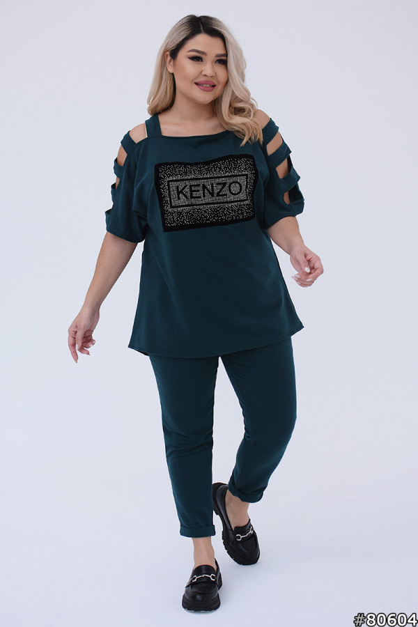 Kolor tureckiego dwunitkowego garnituru: łatka Green Stone. Spodnie z kieszeniami i gumką w pasie. Dobra rozciągliwość materiału