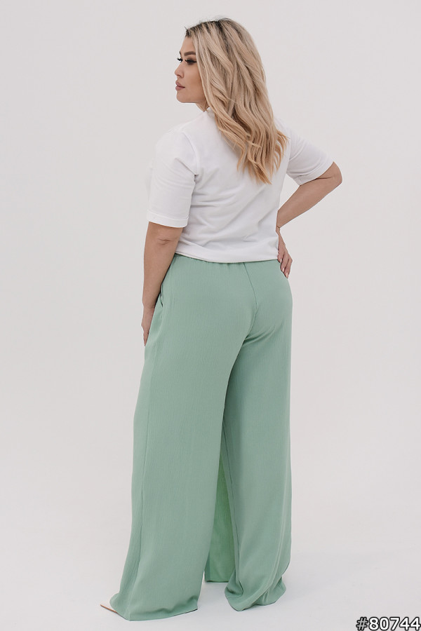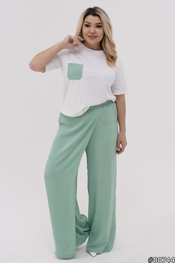 Брючный костюм, состоящий из футболки и брюк. Футболка свободного кроя. Брюки свободного кроя, пояс на резинке.
