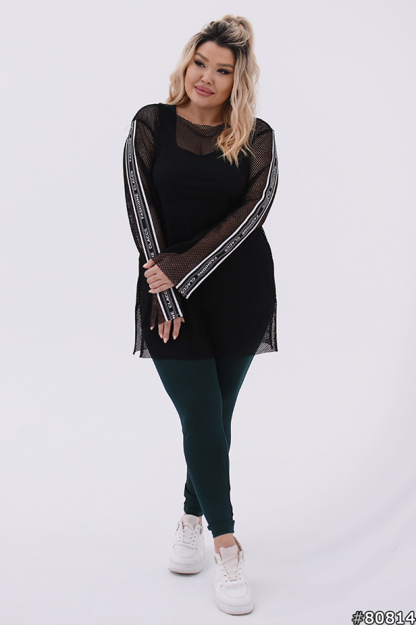Имеет очень хорошую растяжимость +10 см. Высокая посадка лосин делает их очень удобным, и делает эффект утяжки. Удлиненная майка.
