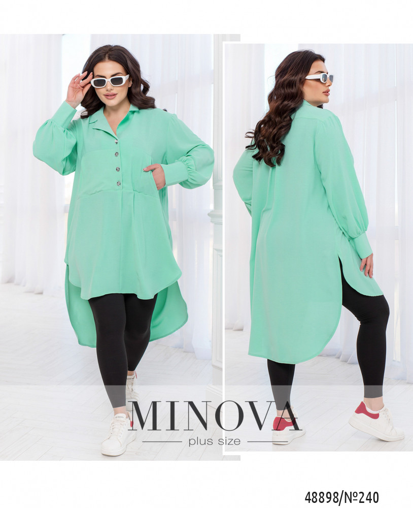 Легкость и удовольствие – вот что отличает нашу новинку, удлиненную блузу, от других моделей. Она изготовлена из качественной ткани и имеет оригинальный крой, что делает ее привлекательной и необычной. А-силуэт блузы добавляет женственности, а отложной воротничок вместе с рядом круглых пуговиц создают великолепный образ. Накладные карманы с имитацией кенгуру на груди придают блузе нотку спортивного стиля и делает ее более нестандартной. Длинные рукава с высоким манжетом дополняют внешний вид блузы и делают ее более практичной. Ткань очень легкая и приятная, а вашему вниманию белый, черный и мятный цвета.