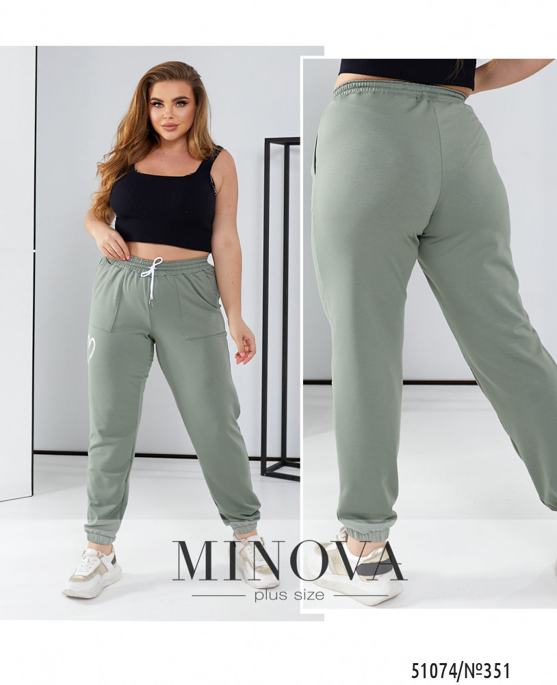 54-56 р-р: довжина брюк по внутрішньому шву 74см, довжина брюк по зовнішньому шву з урахуванням пояса 105см, ОТ - 118см, ОС - 120см.