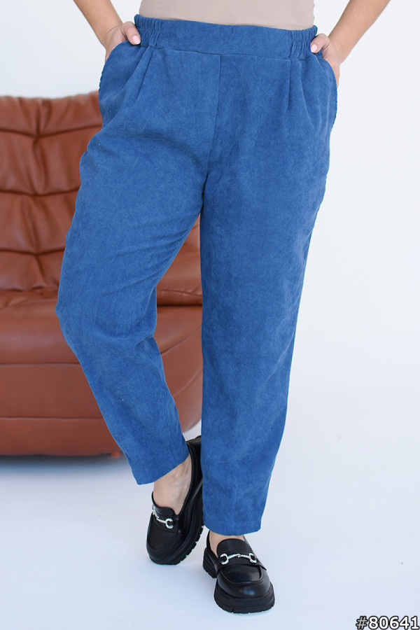 Штани Мікровельвет колір: Джинс Штани вільні,не облягають фігуру,талія на гумці,з кишенями у бокових швахЗаміри готового виробу розмір 52-54: