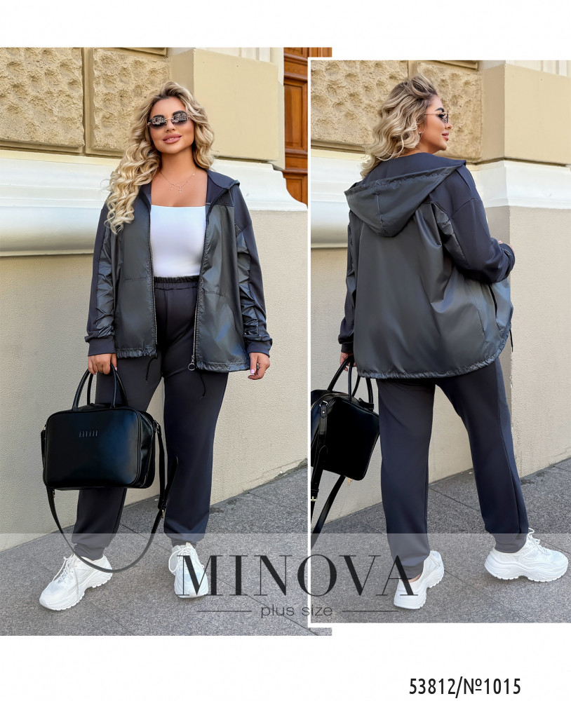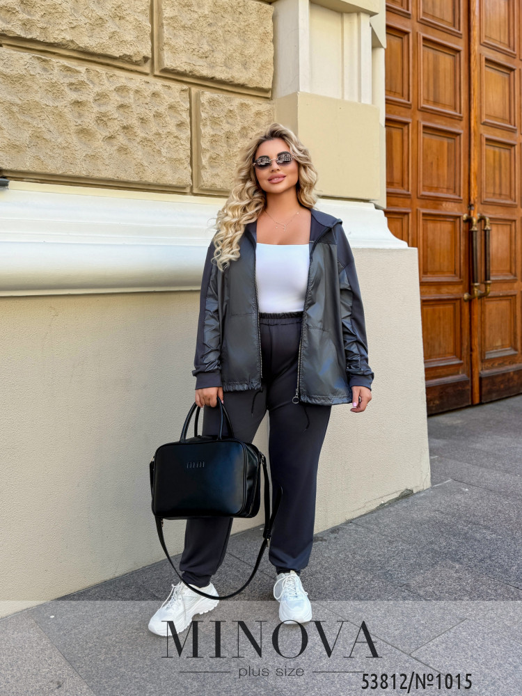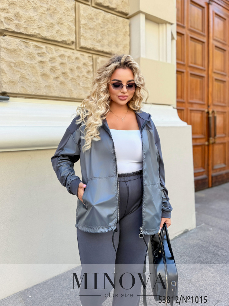 Спортивний костюм з тканини двонитка з додаванням плащівки лаке поєднує стиль і комфорт. Верх представлений у вигляді легкої куртки-ветровки з капюшоном, що застібається на блискавку, та регульованою куліскою по низу. Штани прямого крою із манжетами створюють завершений образ. Плащовка додає легкий блиск і захищає від вітру, а м'яка двонитка забезпечує затишок та свободу рухів. Відмінний вибір для прогулянок чи активного відпочинку.