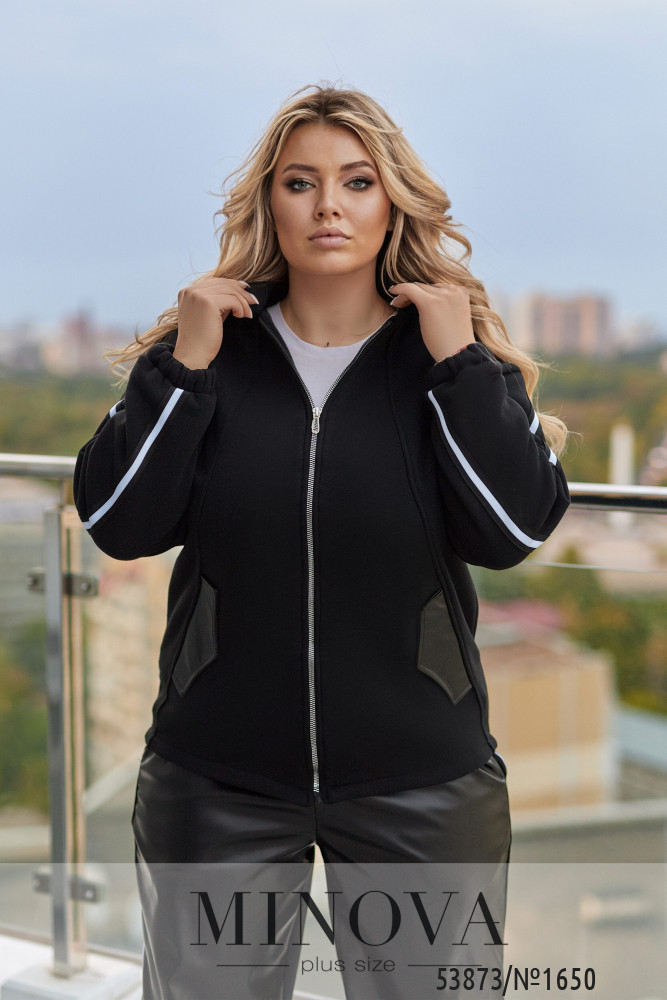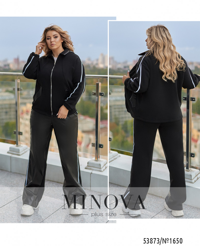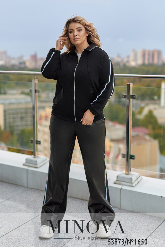 Яскравий, стильний та зручний! Неймовірно шикарний, костюм у насичених трендових кольорах створює динамічний та впевнений образ. Вільний крій та лампаси візуально стрункуть, а м'яка тканина забезпечує комфорт протягом усього дня.Кофта вільного крою, комір з бічними кишенями декоровані шкірою, з застібкою на блискавці, лампаси на рукавах,довгий спущений рукав, манжети на резинці. Брюки: висока посадка,прямий вільний крій, спереду вставки зі штучної шкіри, сзаду -тринитка, пояс на резинці, лампаси з боків.