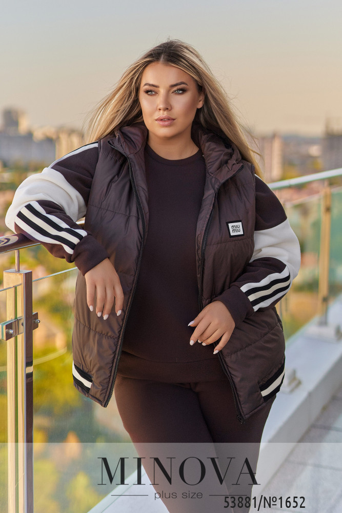 Стильний жіночий спортивний костюм — для тих, хто не готовий обирати між комфортом і модою! ✨ Жилет із стьобаним утеплювачем 150 г, з капюшоном та боковими кишенями, застібається на блискавку. Лампаси на низу та капюшоні, а також нашивка на грудях додають стильного акценту. Підкладка з плащівки забезпечує легкість і практичність. Світшот вільного крою з контрастними білими вставками на рукавах та лампасною стрічкою робить образ трендовим і яскравим. Штани високої посадки з еластичним поясом і кишенями, прямі знизу, гарантують комфорт і свободу рухів. Ідеальний комплект для прогулянок, спорту або стильного повсякденного образу!