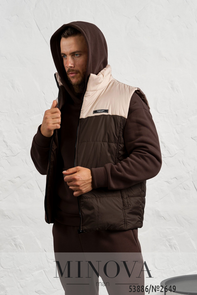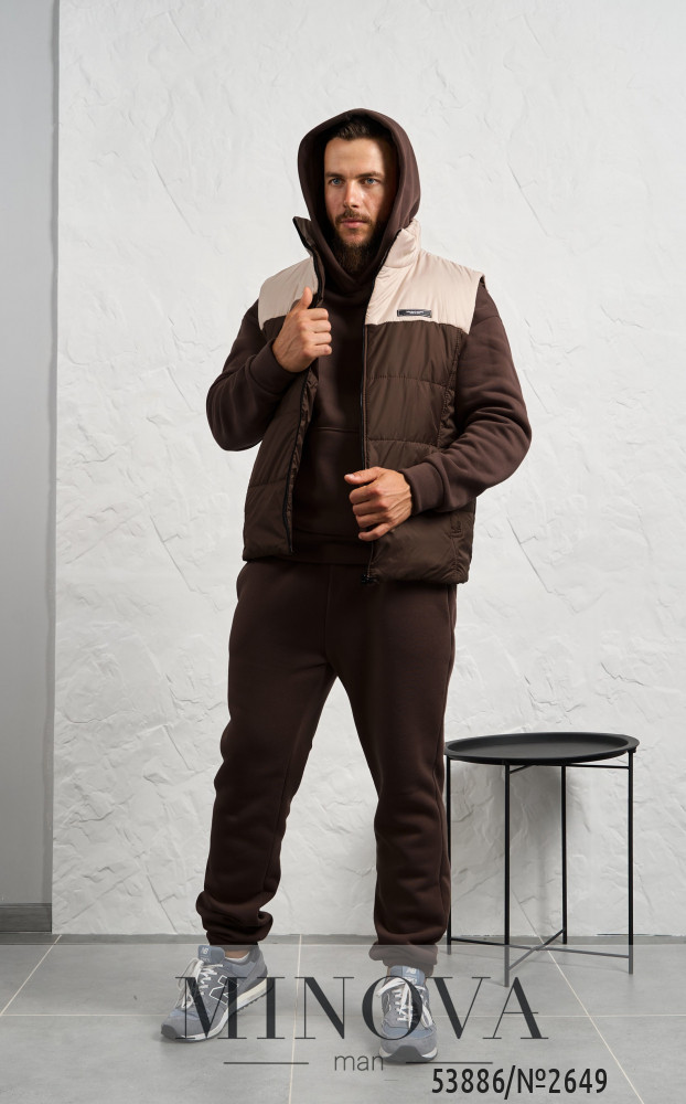 Стильний чоловічий комплект, створений для комфорту у прохолодну погоду. До нього входить теплий спортивний костюм та утеплений жилет. Худі має капюшон зі шнурком, зручну кишеню-кенгуру, манжети на рукавах та декоративну нашивку збоку. Штани прямого крою з високою посадкою, боковими кишенями та еластичними манжетами знизу. Жилет виконаний у стьобаному дизайні з утеплювачем на синтепоні, із підкладкою з плащової тканини. Він застібається на блискавку, має дві бічні кишені та нашивку на грудях. Такий комплект поєднує практичність, тепло і сучасний стиль, ідеально підходячи для щоденного носіння.