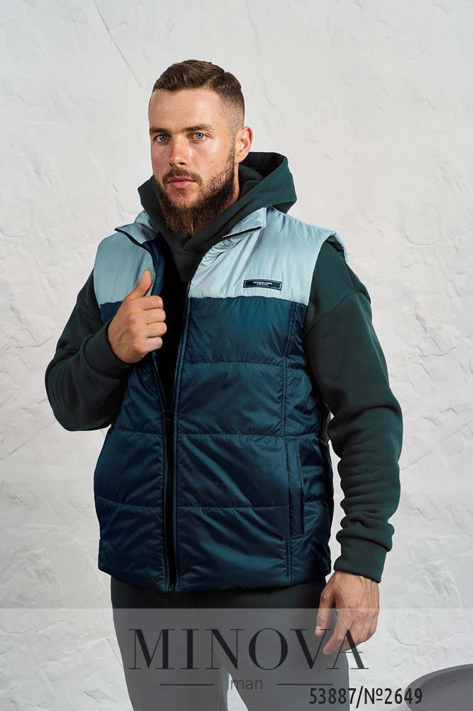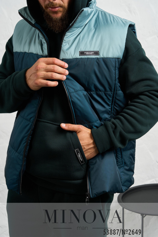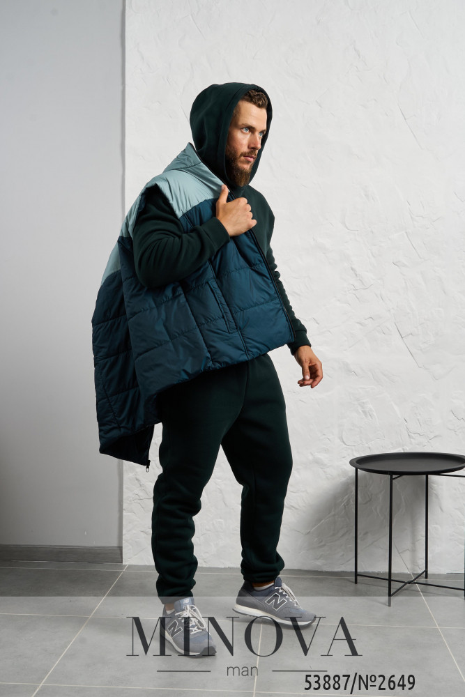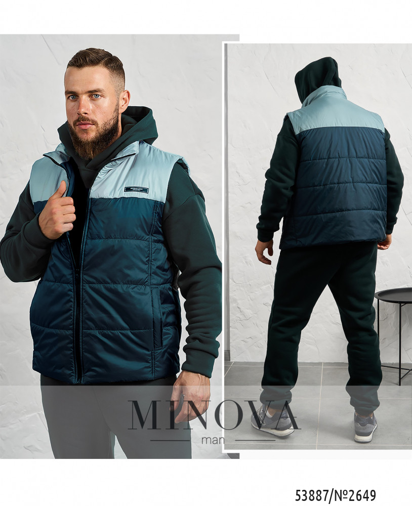 Стильний чоловічий комплект, створений для комфорту у прохолодну погоду. До нього входить теплий спортивний костюм та утеплений жилет. Худі має капюшон зі шнурком, зручну кишеню-кенгуру, манжети на рукавах та декоративну нашивку збоку. Штани прямого крою з високою посадкою, боковими кишенями та еластичними манжетами знизу. Жилет виконаний у стьобаному дизайні з утеплювачем на синтепоні, із підкладкою з плащової тканини. Він застібається на блискавку, має дві бічні кишені та нашивку на грудях. Такий комплект поєднує практичність, тепло і сучасний стиль, ідеально підходячи для щоденного носіння.