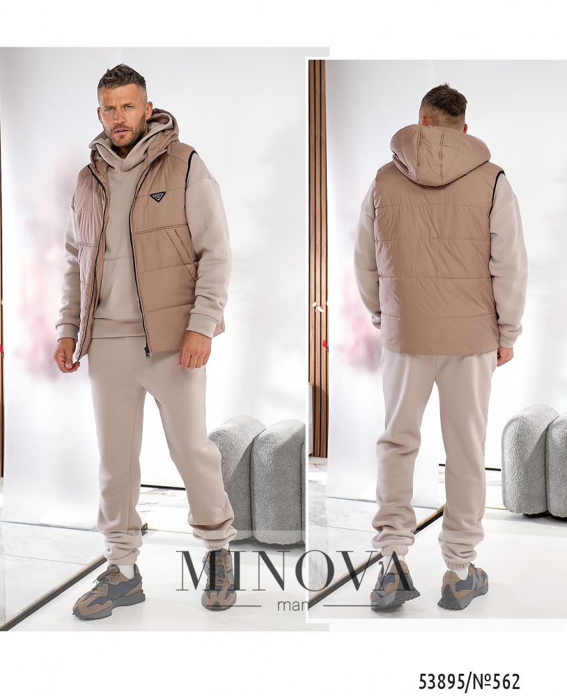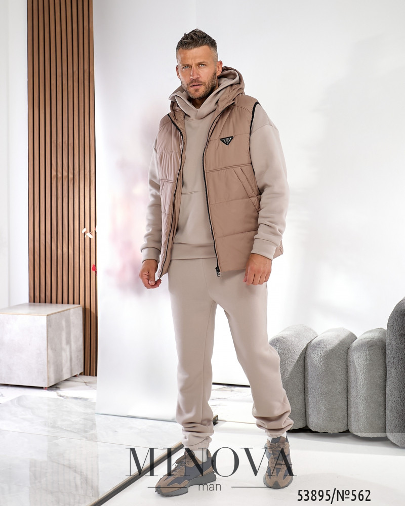 Поєднання теплого костюму й легкого утепленого жилета створює ідеальний баланс між комфортом та практичністю. Якісні матеріали, зручний крій і лаконічний стьобаний дизайн формують образ сучасного чоловіка, який цінує стиль і свободу рухів. Худі з капюшоном та кишенею-кенгуру. Прямий вільний крій, м’який і теплий трикотаж, приємний на дотик. Штани прямого крою з бічними кишенями. Комфортна посадка, еластичний пояс зі шнуром для фіксації та манжети на резинці знизу. Утеплений жилет на блискавці з двома бігунками високої якості. Має вшитий капюшон, п’ять кишень (чотири зовнішні врізні з похилим входом та одна внутрішня). На грудях — стильна нашивка, підкладка виконана з плащової тканини.