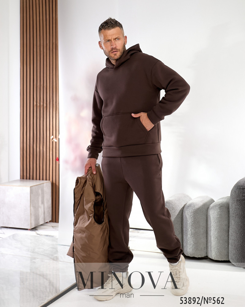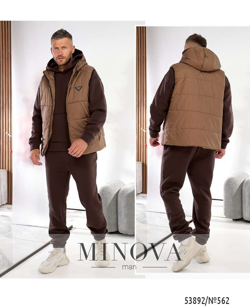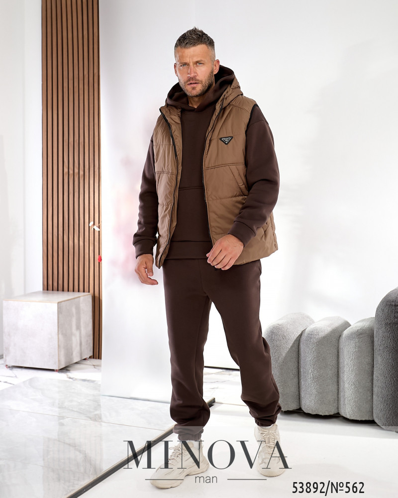 Поєднання теплого костюму й легкого утепленого жилета створює ідеальний баланс між комфортом та практичністю. Якісні матеріали, зручний крій і лаконічний стьобаний дизайн формують образ сучасного чоловіка, який цінує стиль і свободу рухів. Худі з капюшоном та кишенею-кенгуру. Прямий вільний крій, м’який і теплий трикотаж, приємний на дотик. Штани прямого крою з бічними кишенями. Комфортна посадка, еластичний пояс зі шнуром для фіксації та манжети на резинці знизу. Утеплений жилет на блискавці з двома бігунками високої якості. Має вшитий капюшон, п’ять кишень (чотири зовнішні врізні з похилим входом та одна внутрішня). На грудях — стильна нашивка, підкладка виконана з плащової тканини.