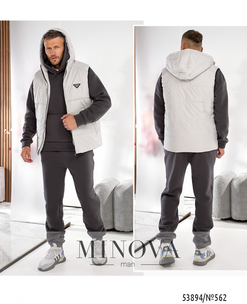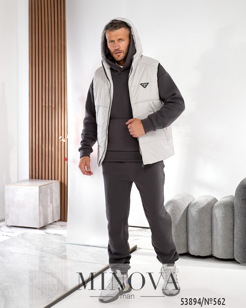Поєднання теплого костюму й легкого утепленого жилета створює ідеальний баланс між комфортом та практичністю. Якісні матеріали, зручний крій і лаконічний стьобаний дизайн формують образ сучасного чоловіка, який цінує стиль і свободу рухів. Худі з капюшоном та кишенею-кенгуру. Прямий вільний крій, м’який і теплий трикотаж, приємний на дотик. Штани прямого крою з бічними кишенями. Комфортна посадка, еластичний пояс зі шнуром для фіксації та манжети на резинці знизу. Утеплений жилет на блискавці з двома бігунками високої якості. Має вшитий капюшон, п’ять кишень (чотири зовнішні врізні з похилим входом та одна внутрішня). На грудях — стильна нашивка, підкладка виконана з плащової тканини.