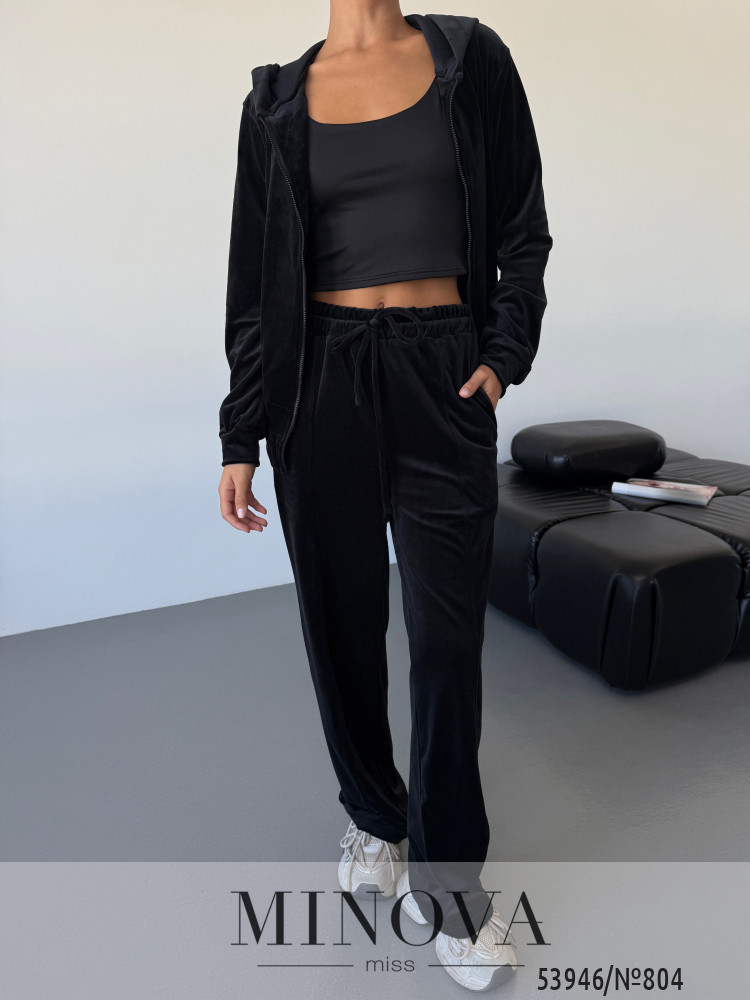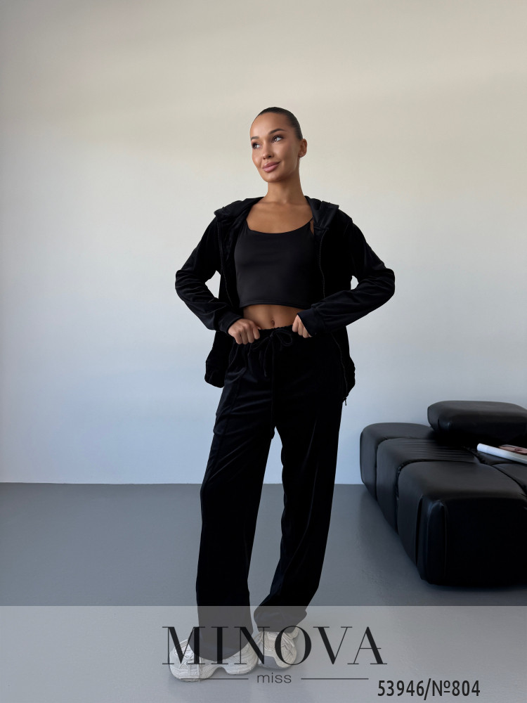 Трендовий велюровий костюм для стильних повсякденних образів.Кофта вільного крою з капюшоном і застібкою на блискавку створює сучасний силует і захищає від прохолоди. Прямі штани з еластичною талією та двома кишенями дарують максимальний комфорт. М’який велюр приємний до тіла та виглядає розкішно, роблячи костюм ідеальним вибором на кожен день.