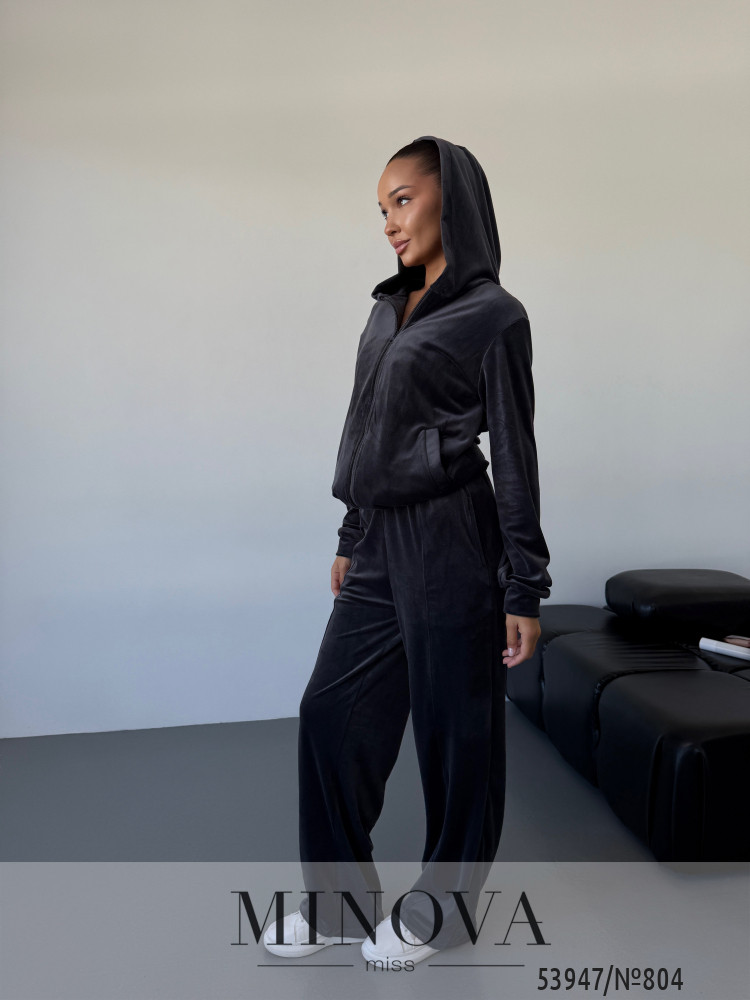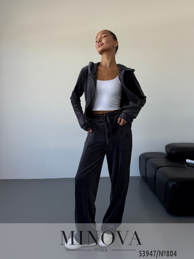 Трендовий велюровий костюм для стильних повсякденних образів.Кофта вільного крою з капюшоном і застібкою на блискавку створює сучасний силует і захищає від прохолоди. Прямі штани з еластичною талією та двома кишенями дарують максимальний комфорт. М’який велюр приємний до тіла та виглядає розкішно, роблячи костюм ідеальним вибором на кожен день.