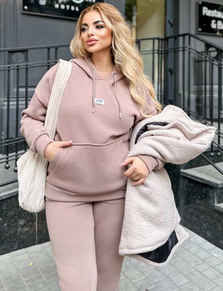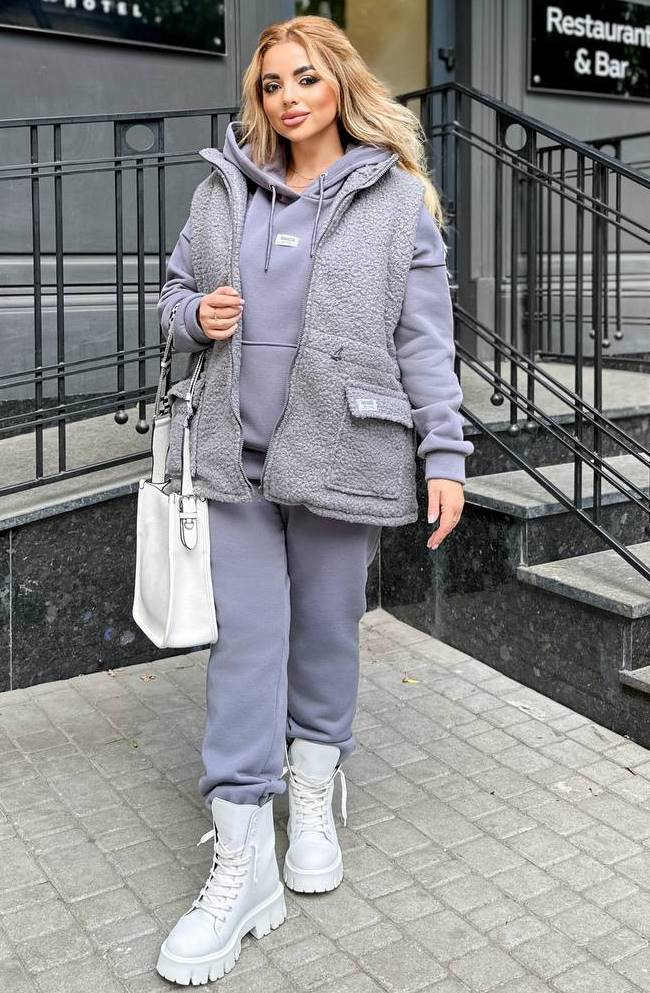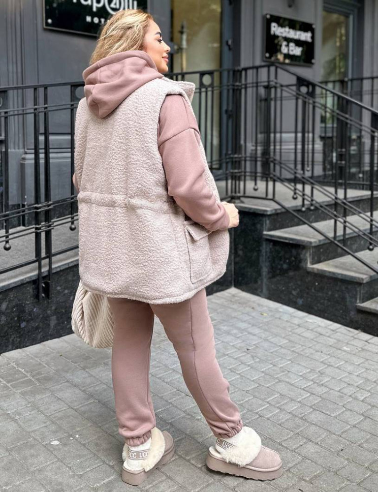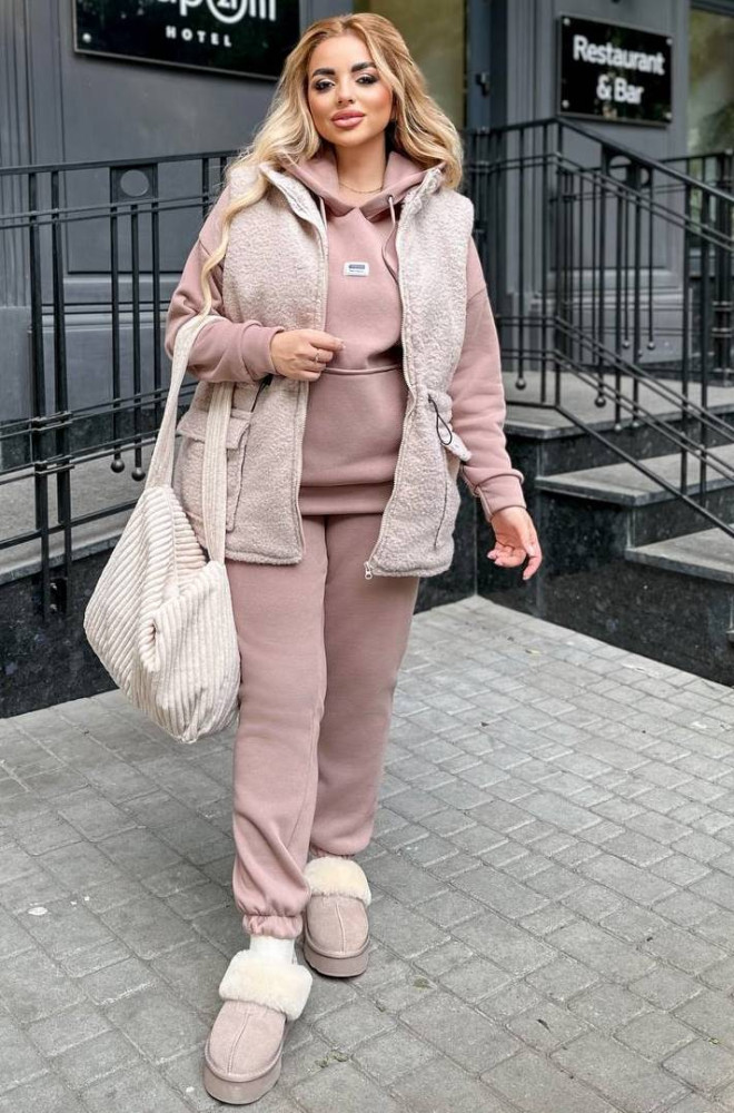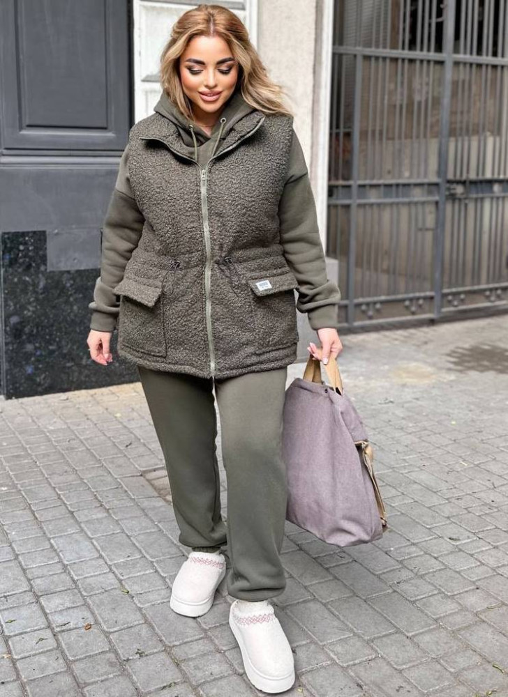 54-56 Кофта: ог-138, от-128, рукав реглан від ворота-77, довжина-70. Штани: резинка-100 = 120, ос-126, довжина-104. Жилет: ог-142, от-142, довжина-77 см.