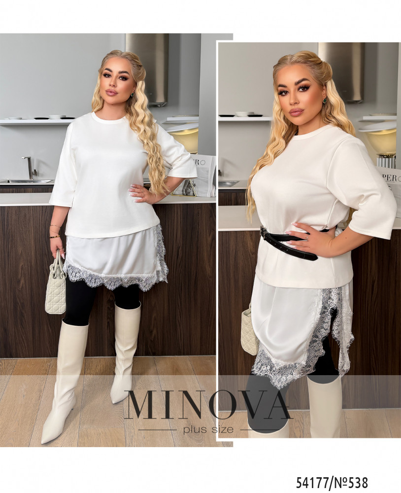 Туніка з шовком і мереживом — витончений варіант для образів із настроєм ніжності та легкого шику.Модель виконана з делікатного матеріалу з додаванням шовку, який м’яко лягає по фігурі, приємний до тіла та має благородний легкий блиск. Низ оздоблений мереживом — саме цей акцент додає образу жіночності та витонченості.Напівкруглий виріз горловини виглядає акуратно та універсально, гармонійно підкреслює лінію шиї. Рукави довжиною 3/4 із заниженою лінією плеча створюють розслаблений, сучасний силует і забезпечують комфорт у носінні.Туніка легко комбінується з брюками, лосинами або спідницею — підходить як для повсякденних образів, так і для більш елегантних виходів.